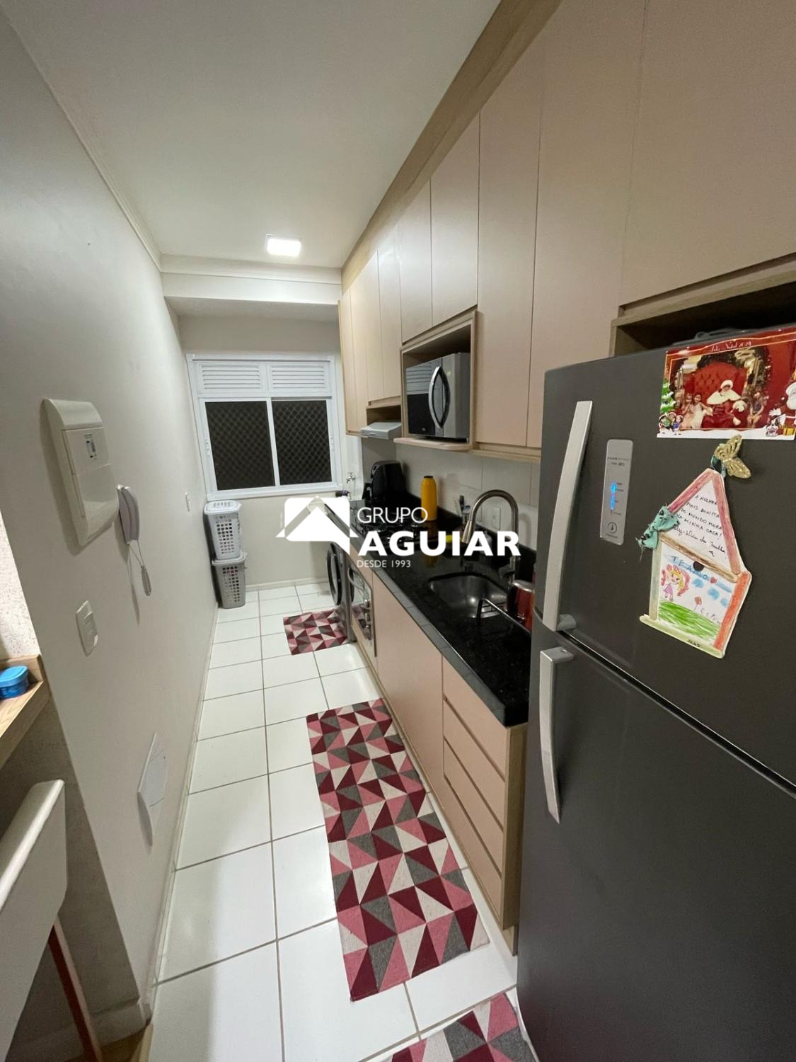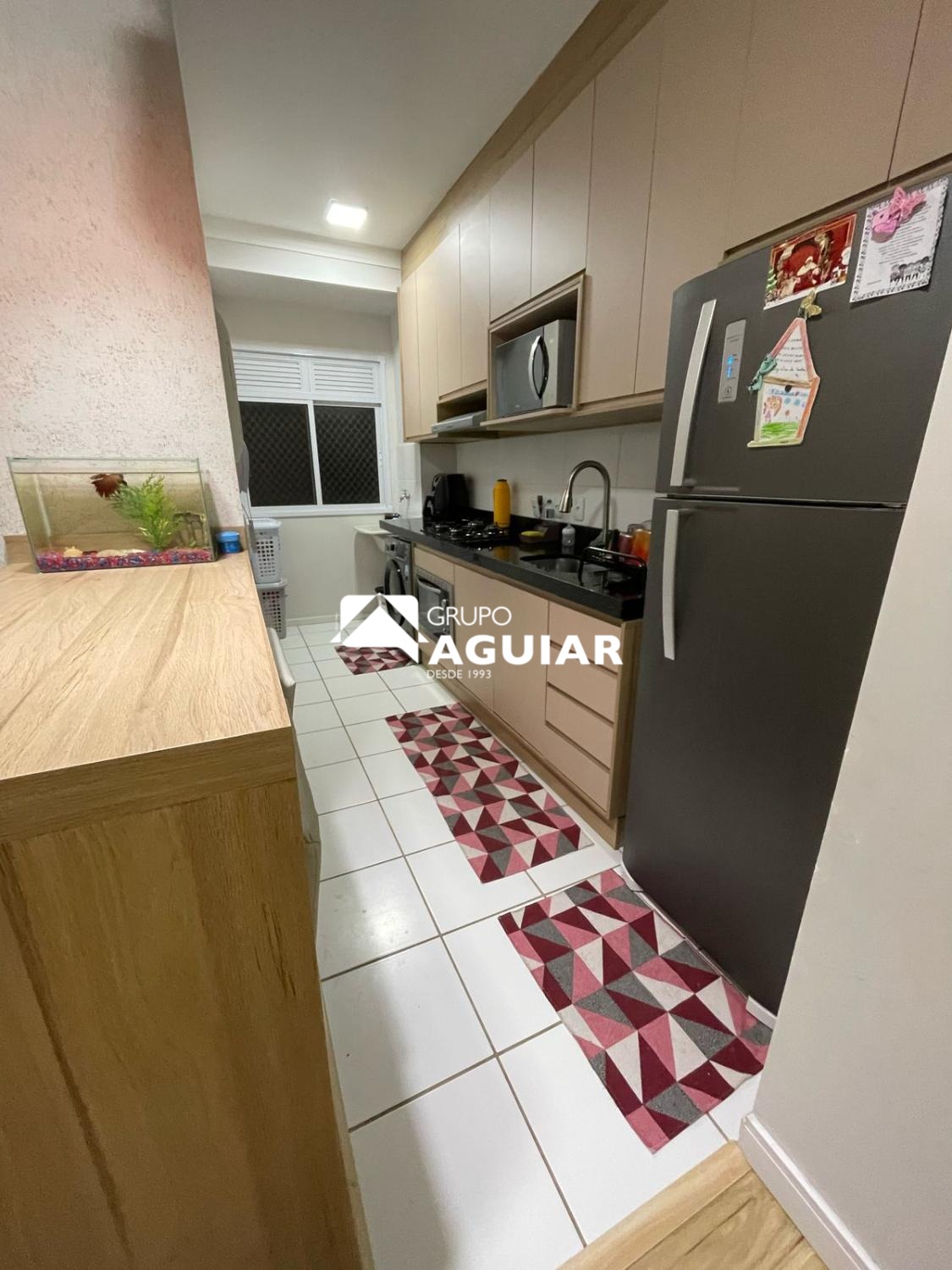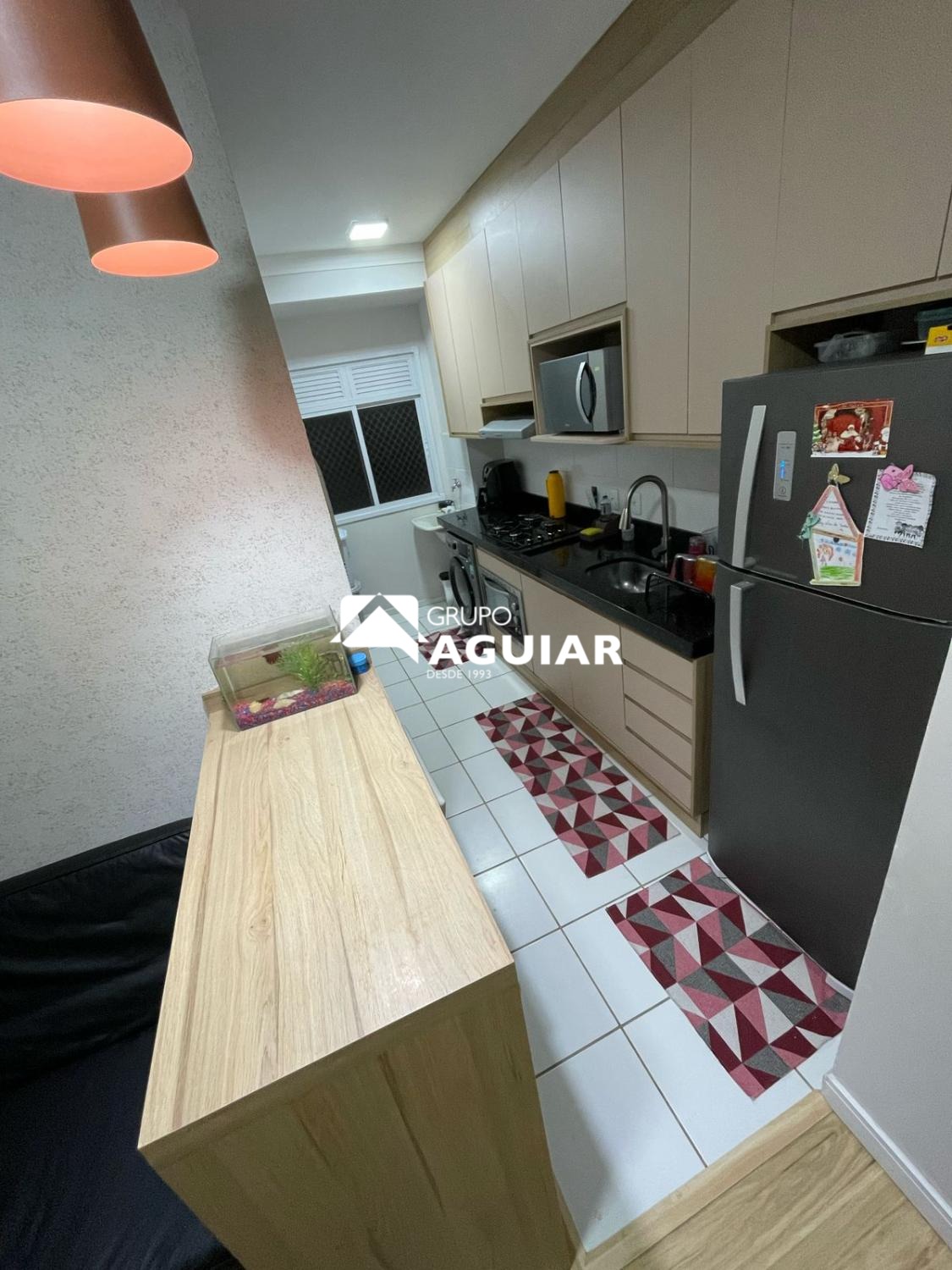 Cozinha planejada e funcional, já equipada com fogão, geladeira, eletrodomésticos completos.