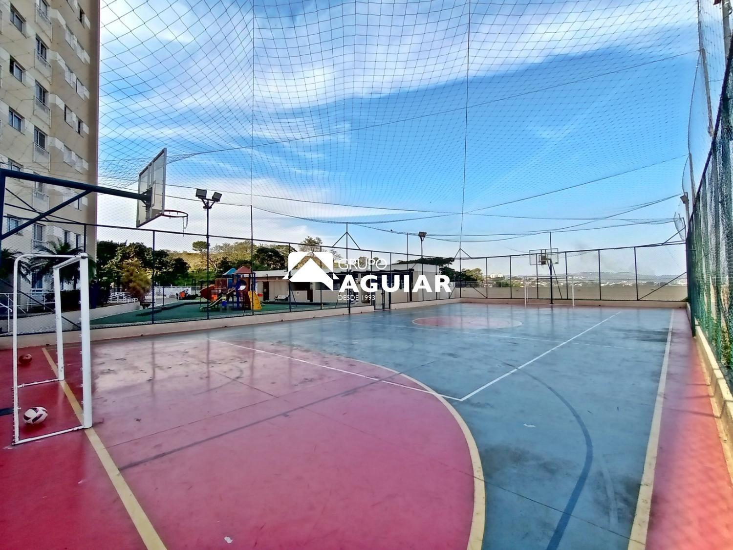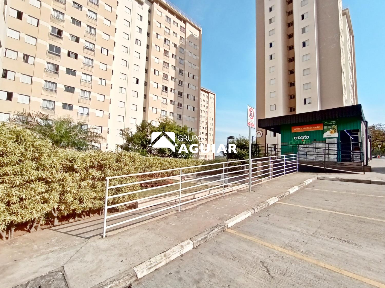 Condomínio oferece portaria com segurança 24 horas, piscina, salão de festas, mini mercado enxuto aqui, quadra poliesportiva e playground.