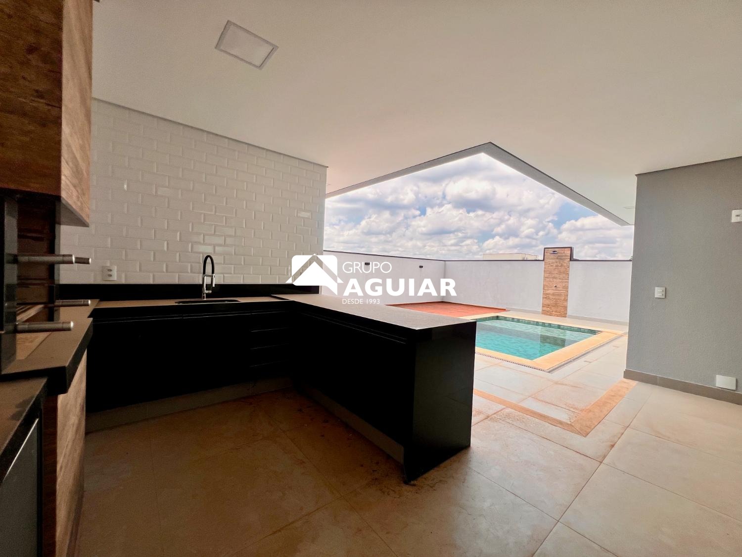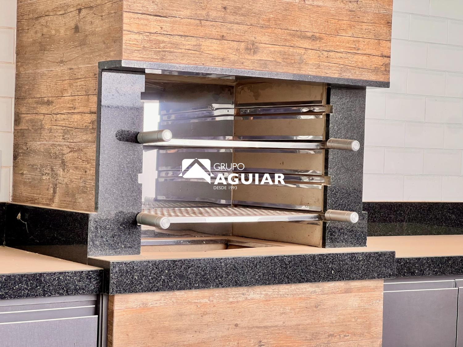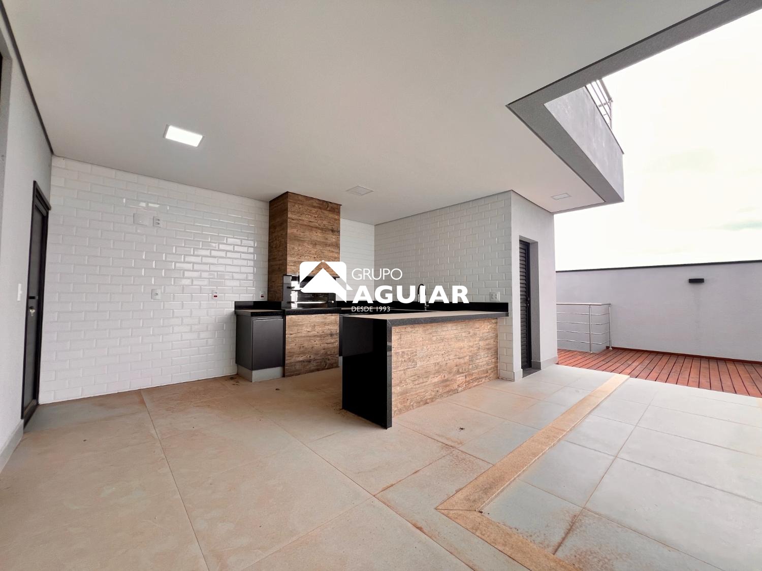Cozinha americana integrada à área gourmet com churrasqueira e banheiro externo