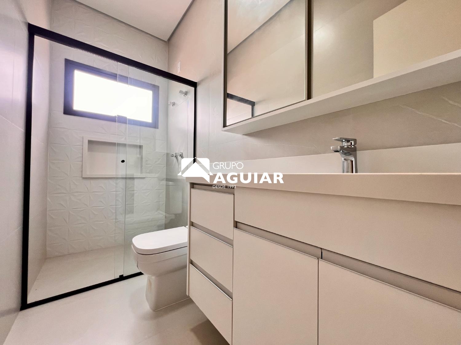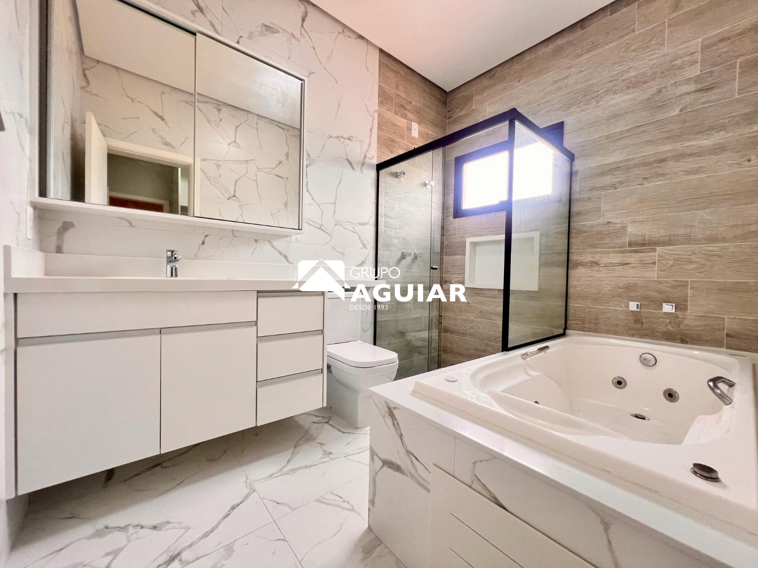 3 suítes com sacada, sendo 1 suíte máster com closet e banheira de hidromassagem, persianas automatizadas e infraestrutura para ar-condicionado