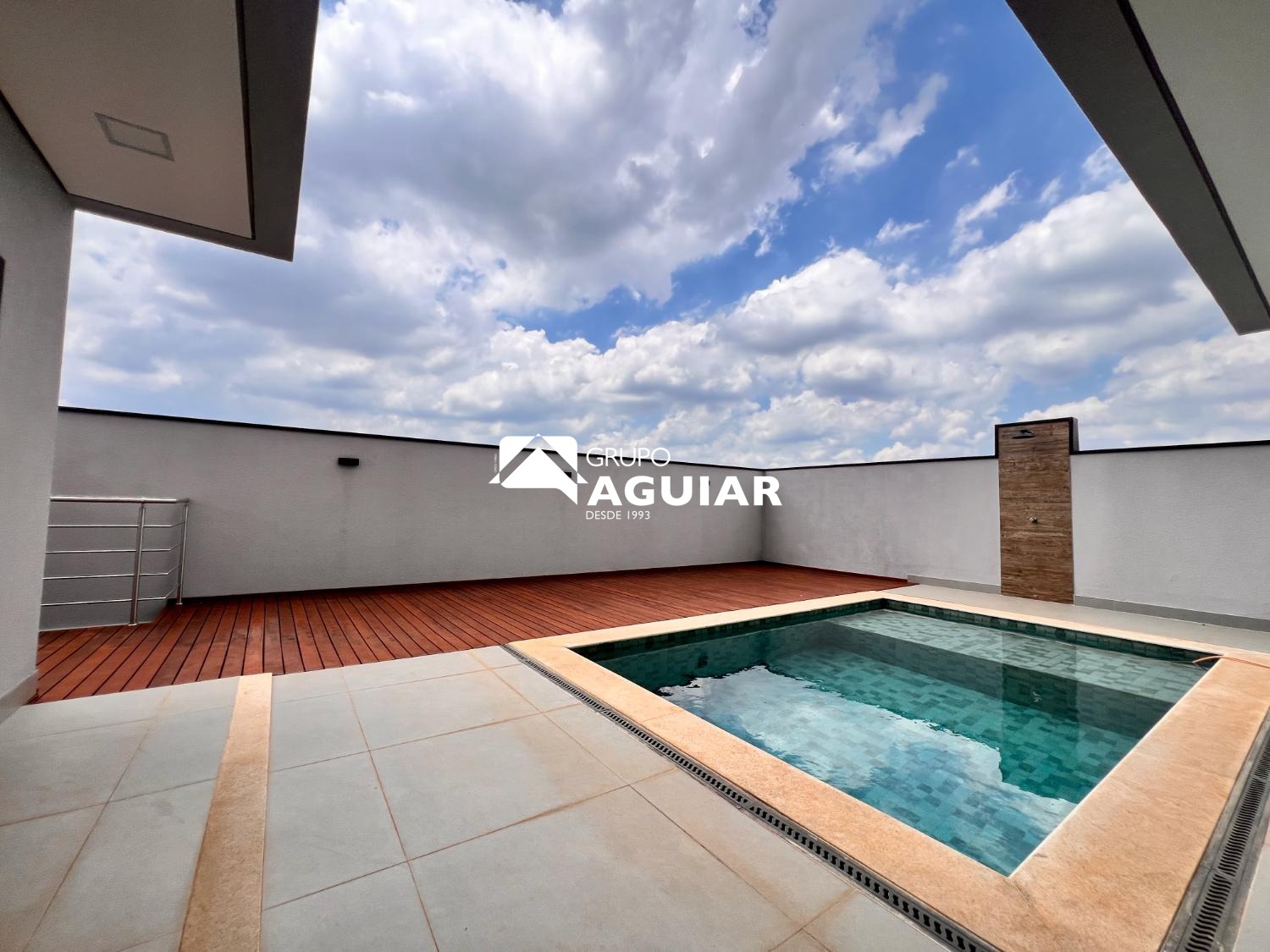 Piscina aquecida com deck em madeira e ducha no quintal
