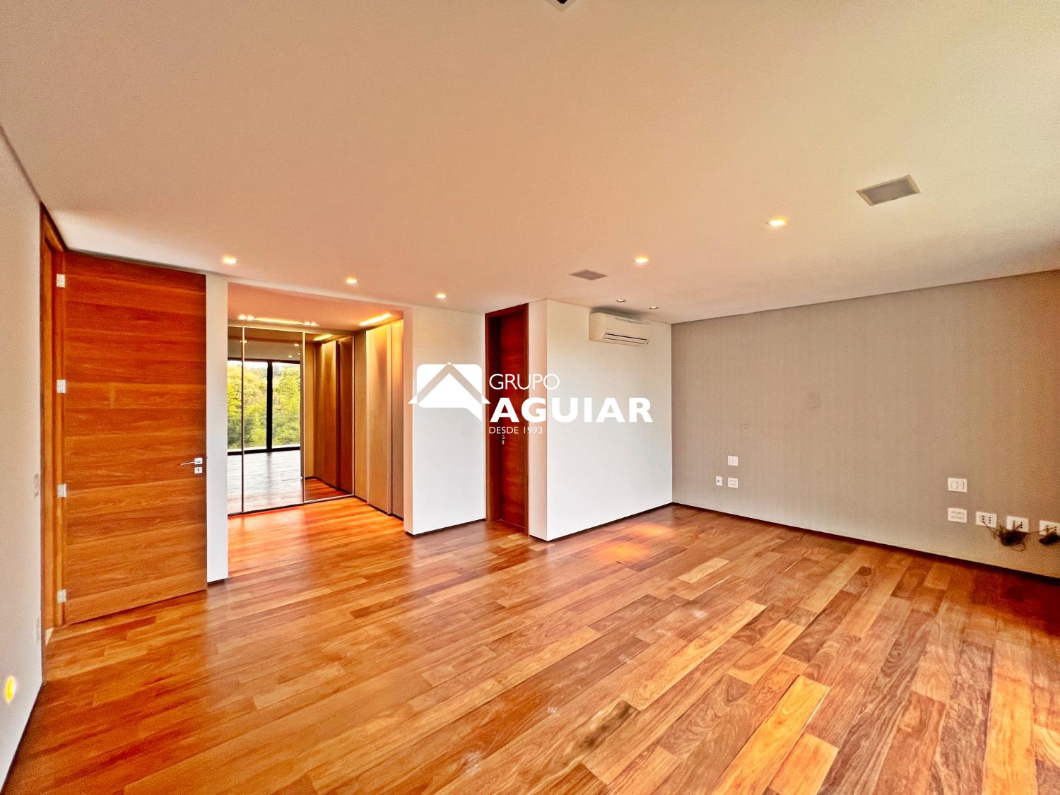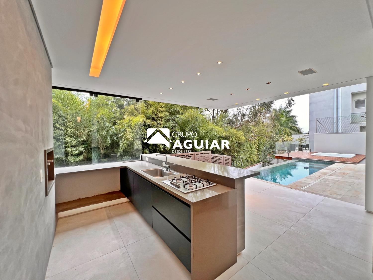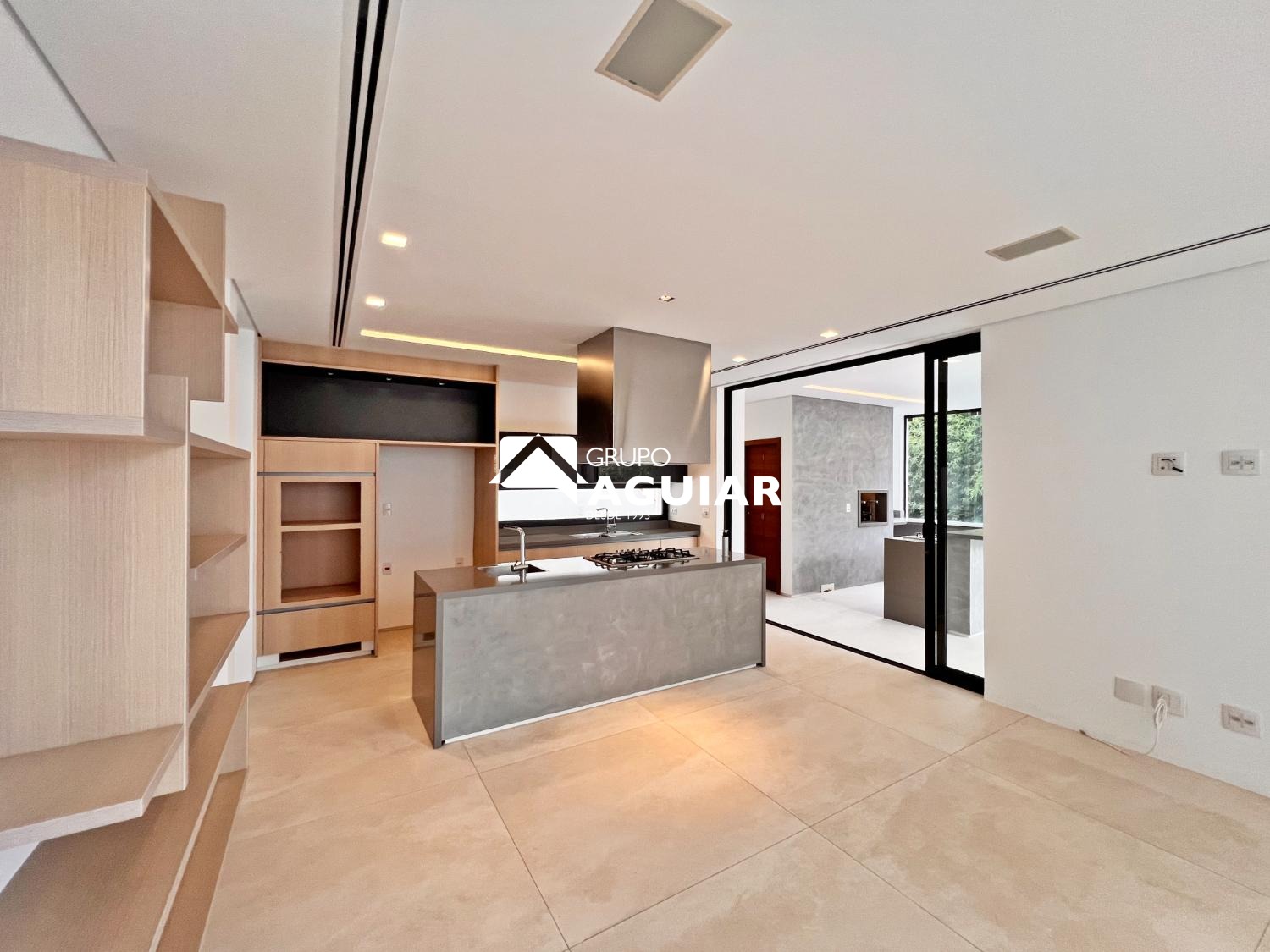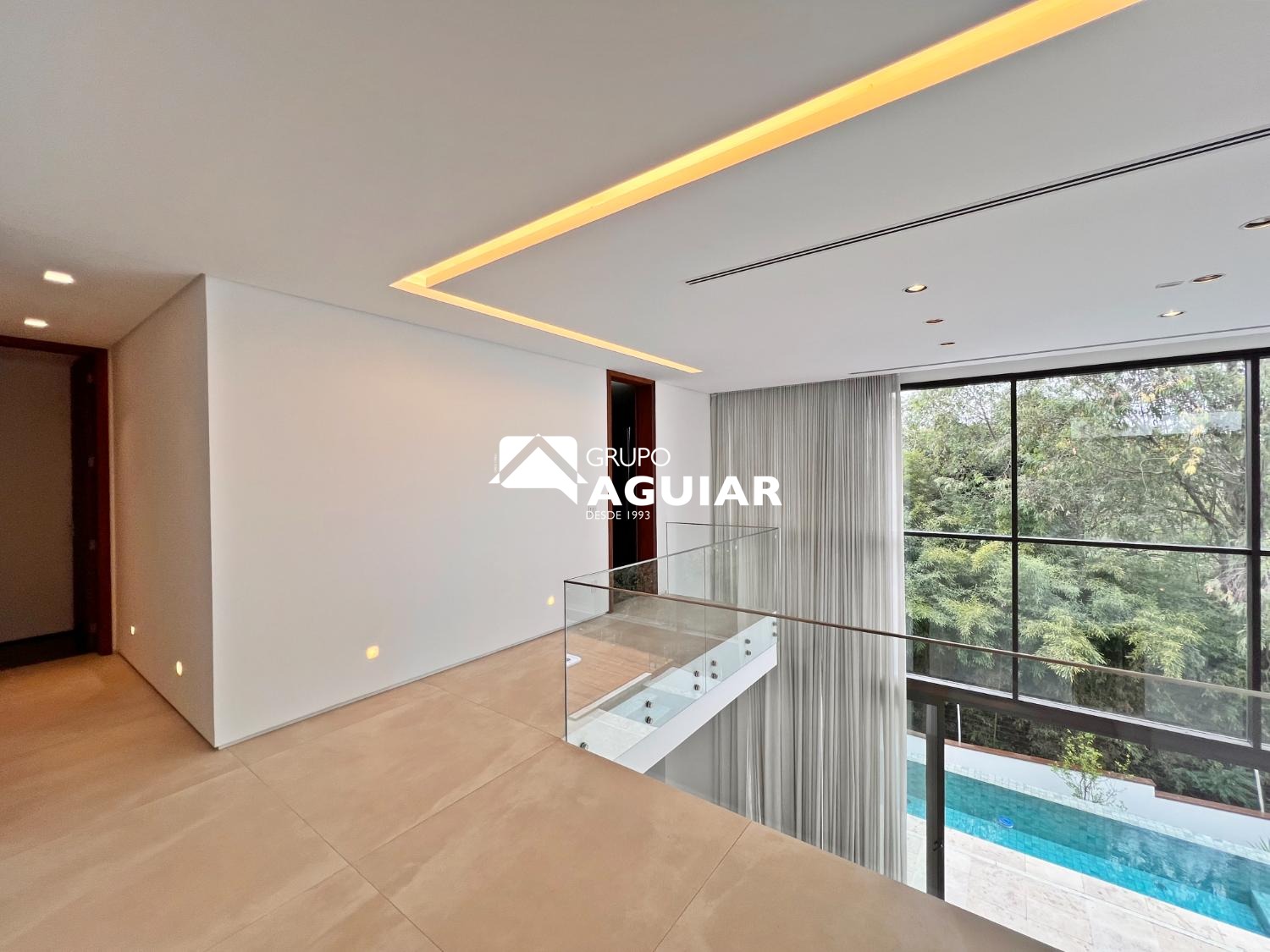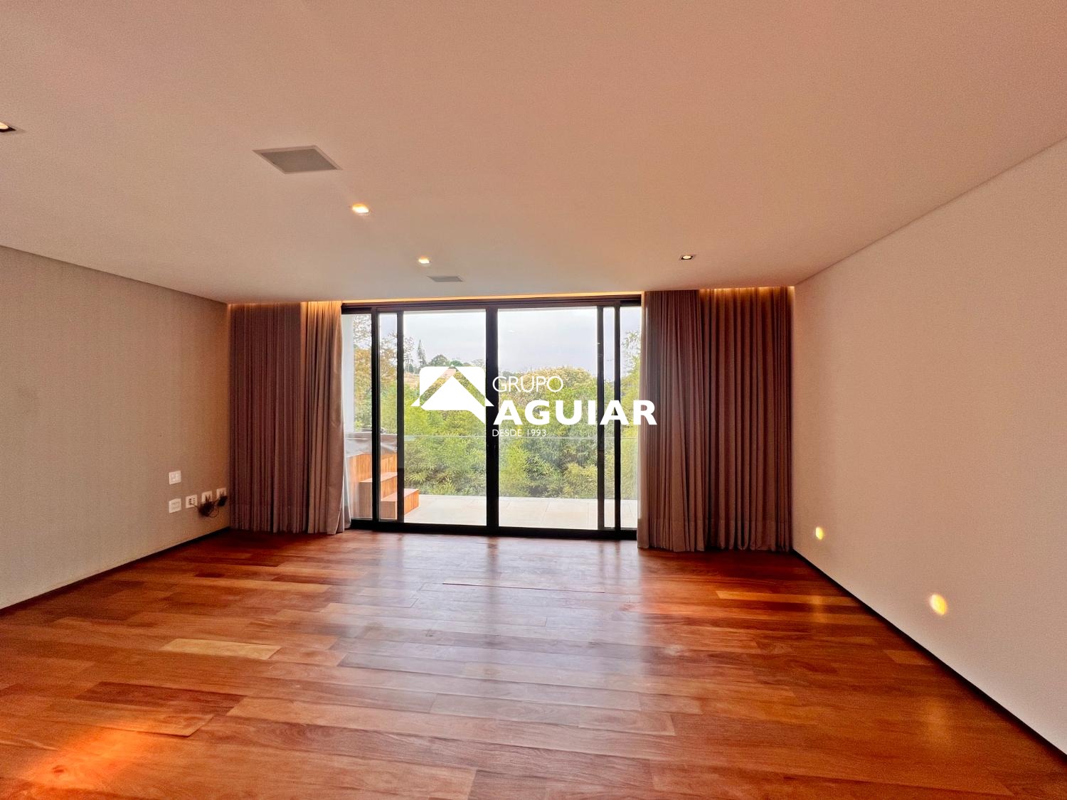 A casa conta com 5 dormitórios (4 suítes), incluindo suíte máster com isolamento acústico, varanda privativa e ofurô com vista para a mata. Ambientes amplos e integrados: sala de estar com pé-direito de 7m, home theater, sala de jantar e cozinha planejada Kitchens com espaço gourmet.