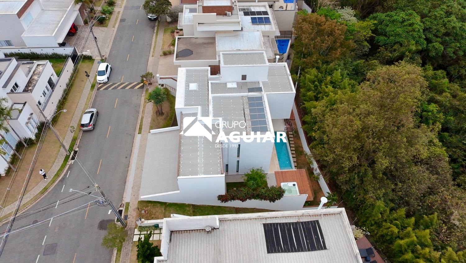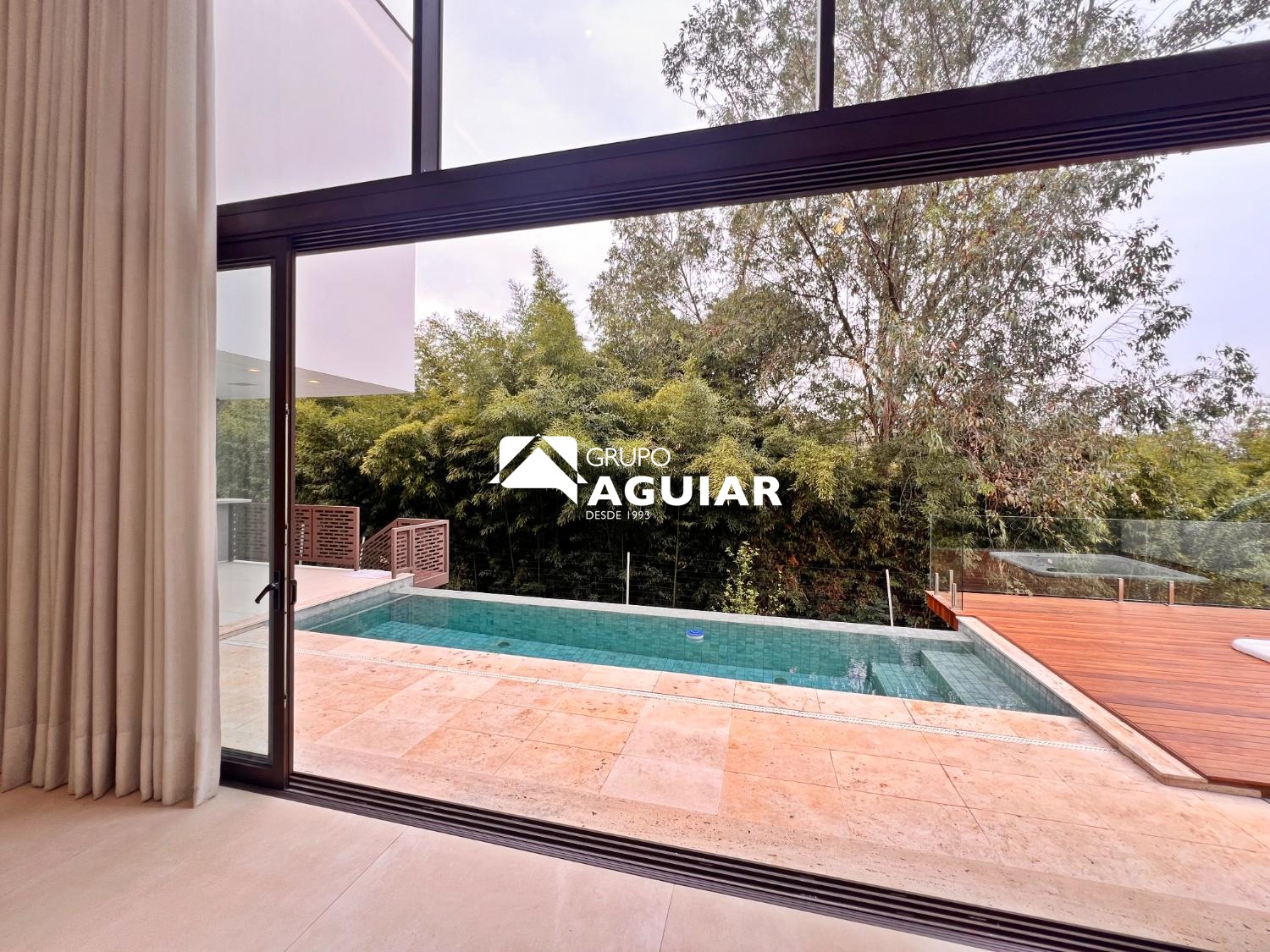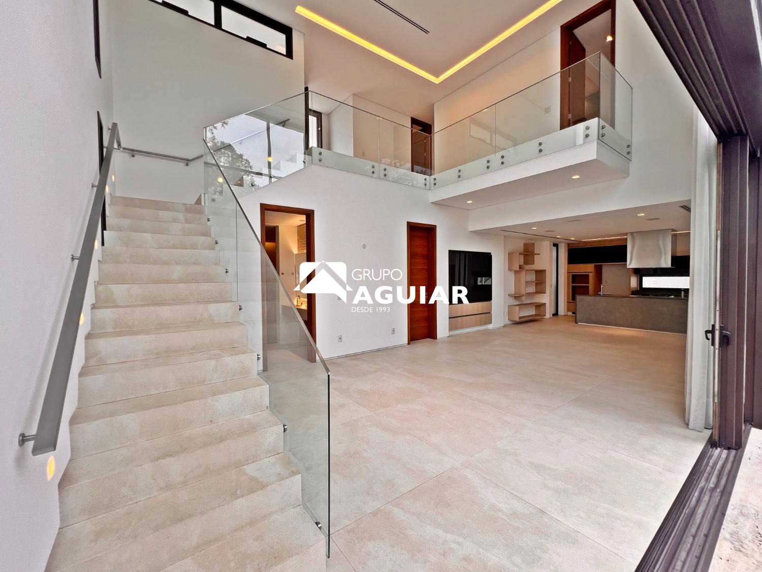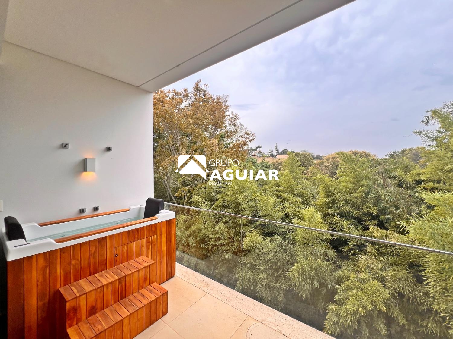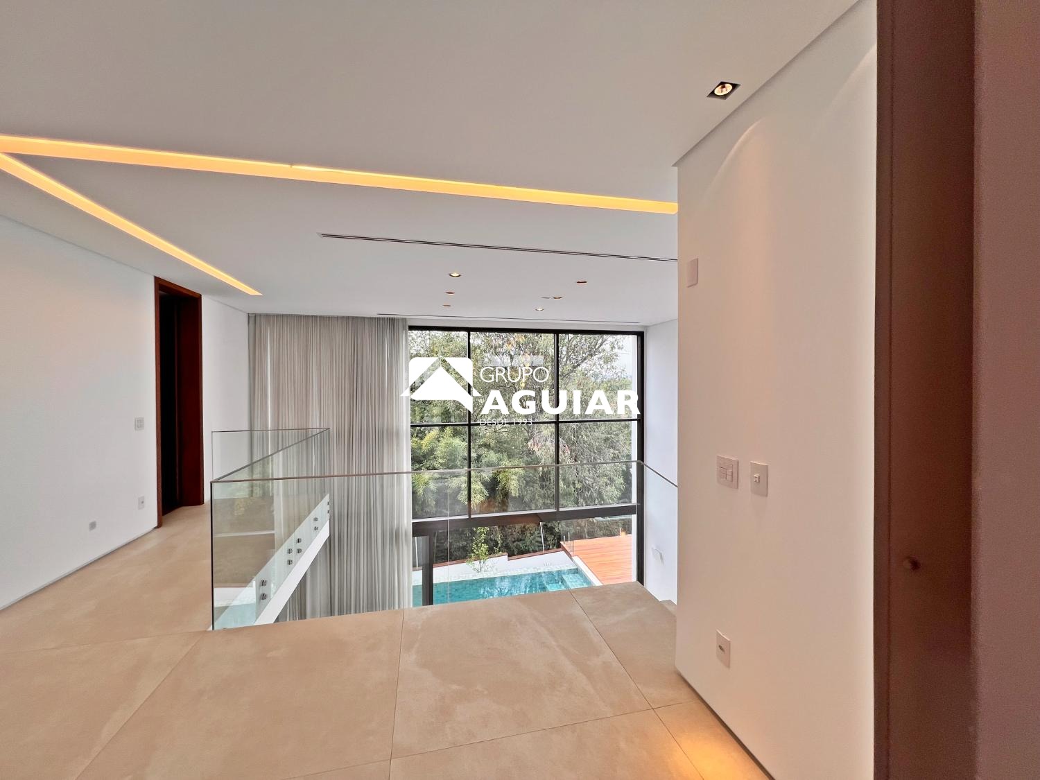 A casa conta com 5 dormitórios (4 suítes), incluindo suíte máster com isolamento acústico, varanda privativa e ofurô com vista para a mata. Ambientes amplos e integrados: sala de estar com pé-direito de 7m, home theater, sala de jantar e cozinha planejada Kitchens com espaço gourmet.