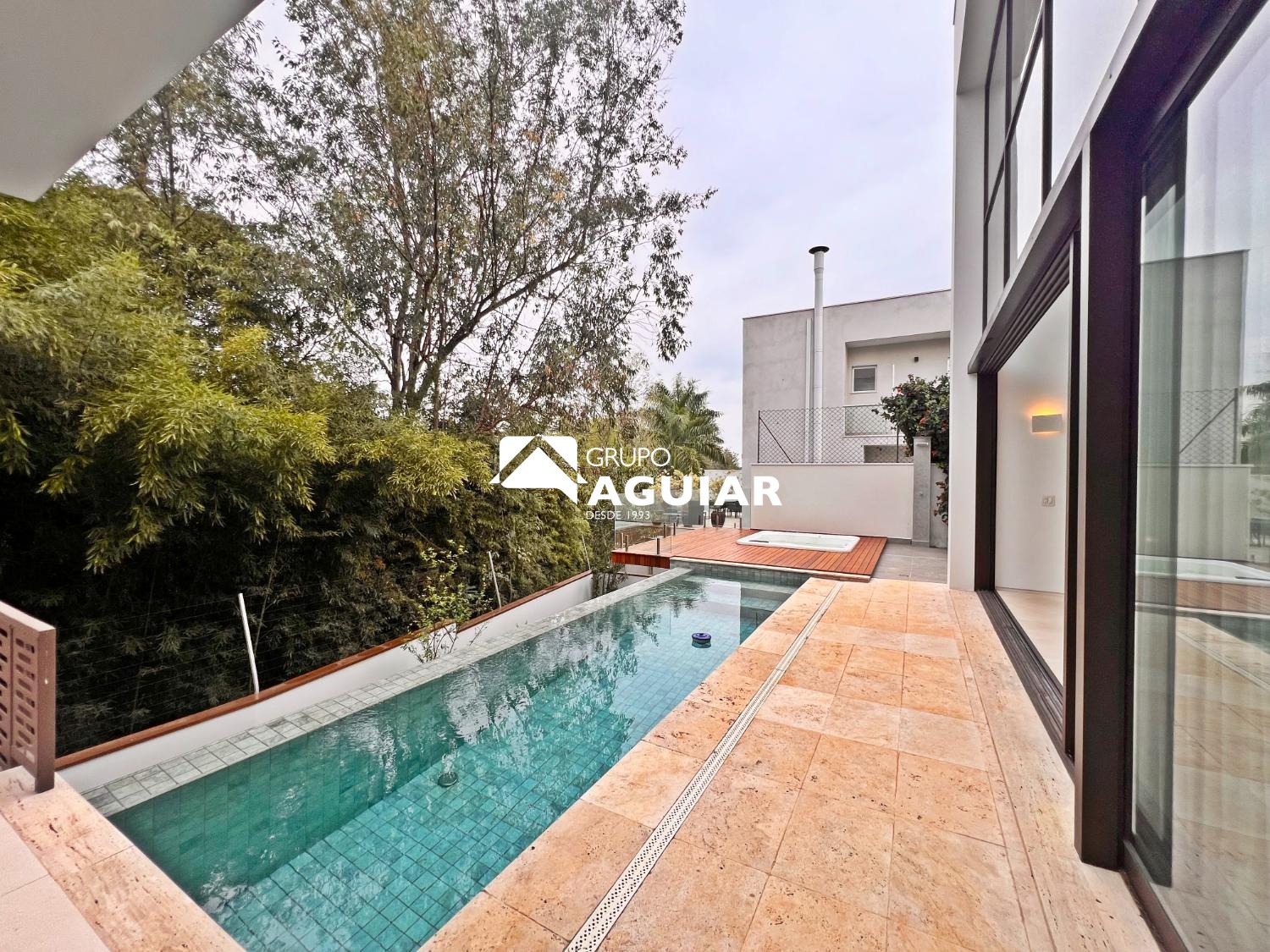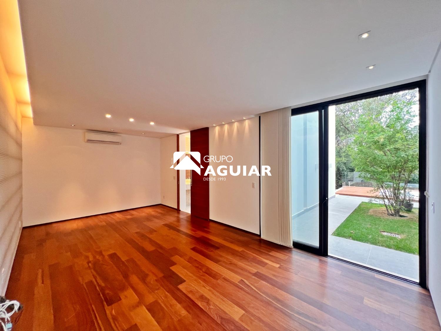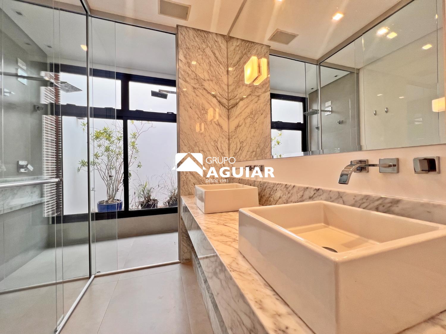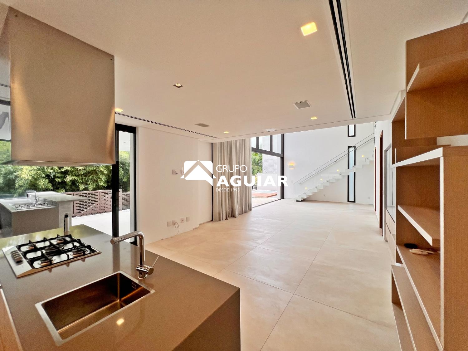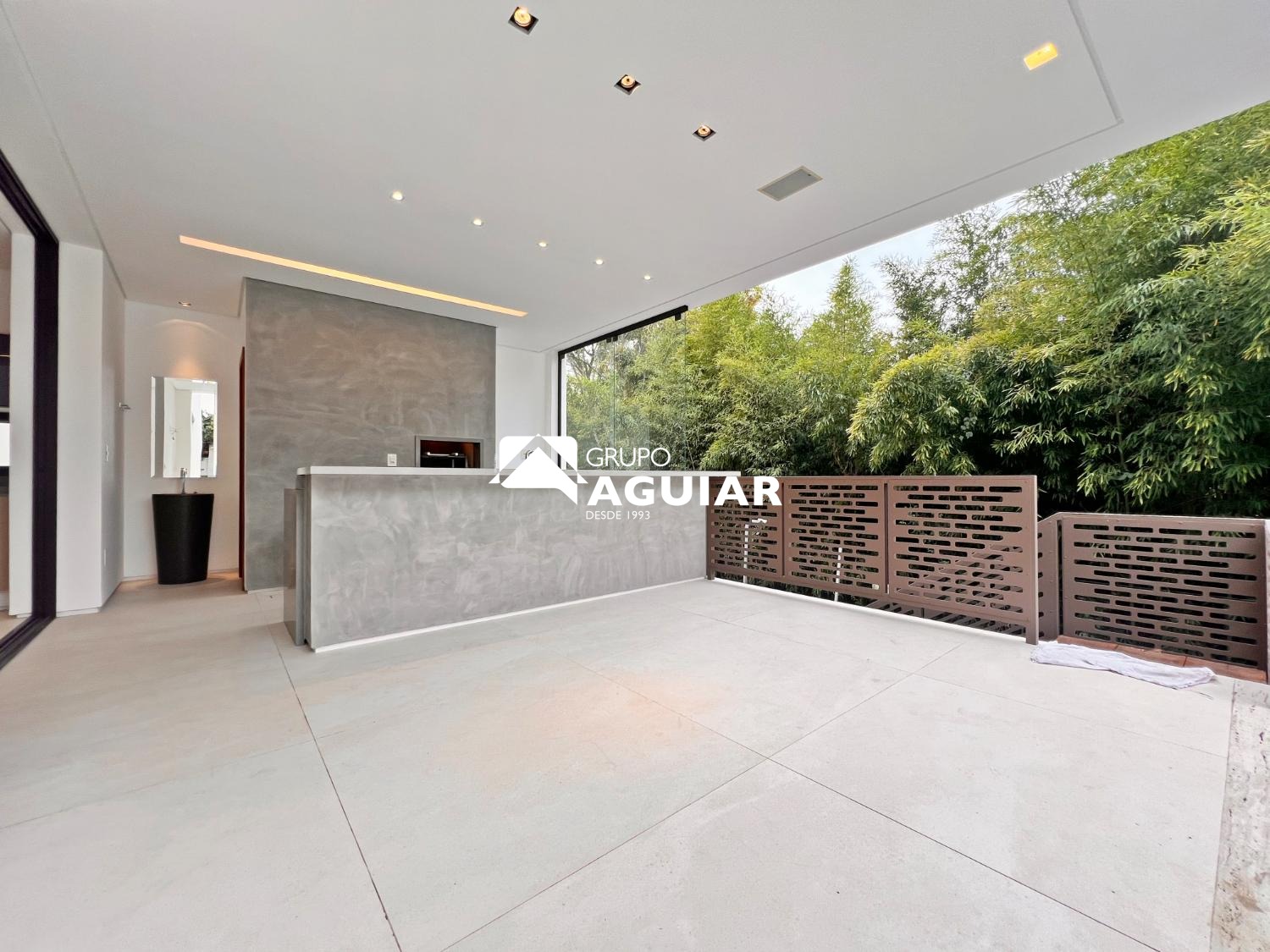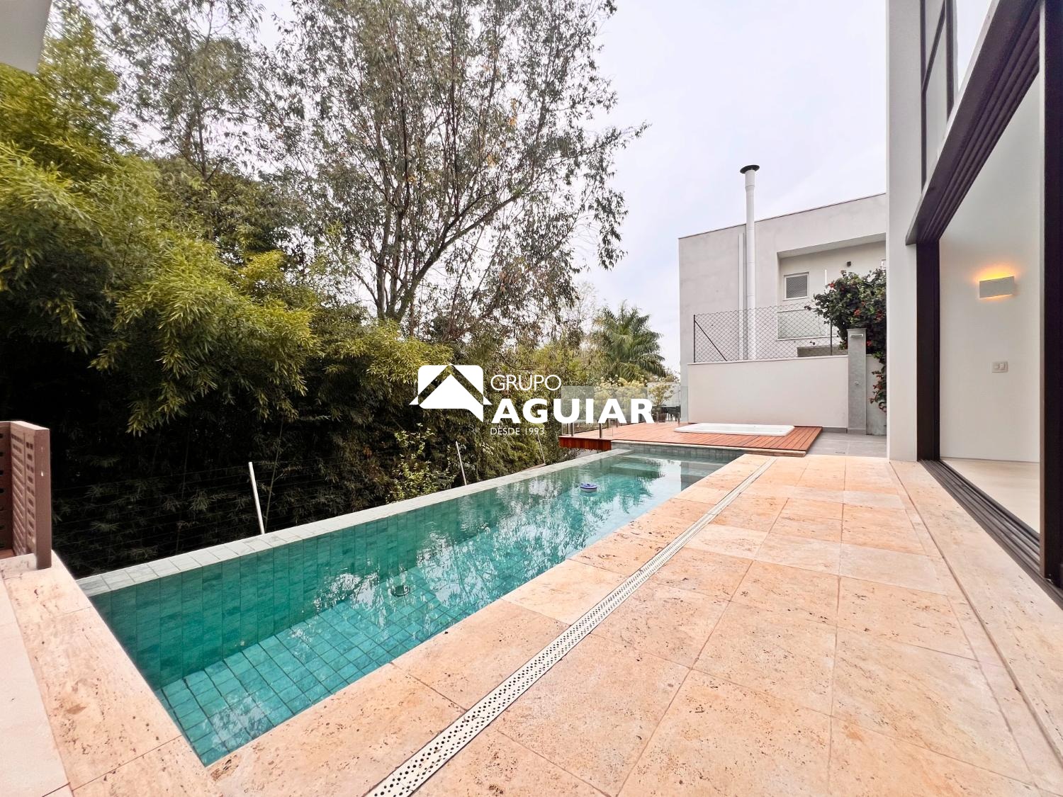A casa conta com 5 dormitórios (4 suítes), incluindo suíte máster com isolamento acústico, varanda privativa e ofurô com vista para a mata. Ambientes amplos e integrados: sala de estar com pé-direito de 7m, home theater, sala de jantar e cozinha planejada Kitchens com espaço gourmet.