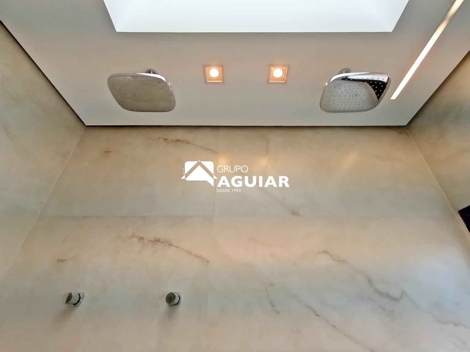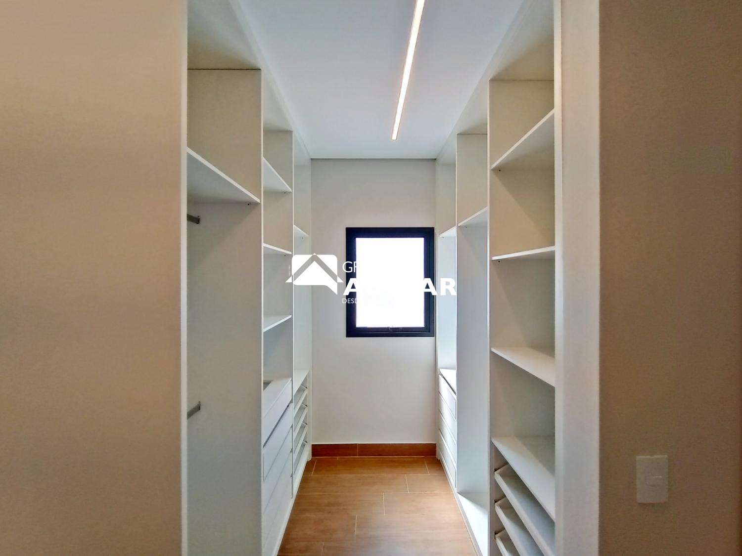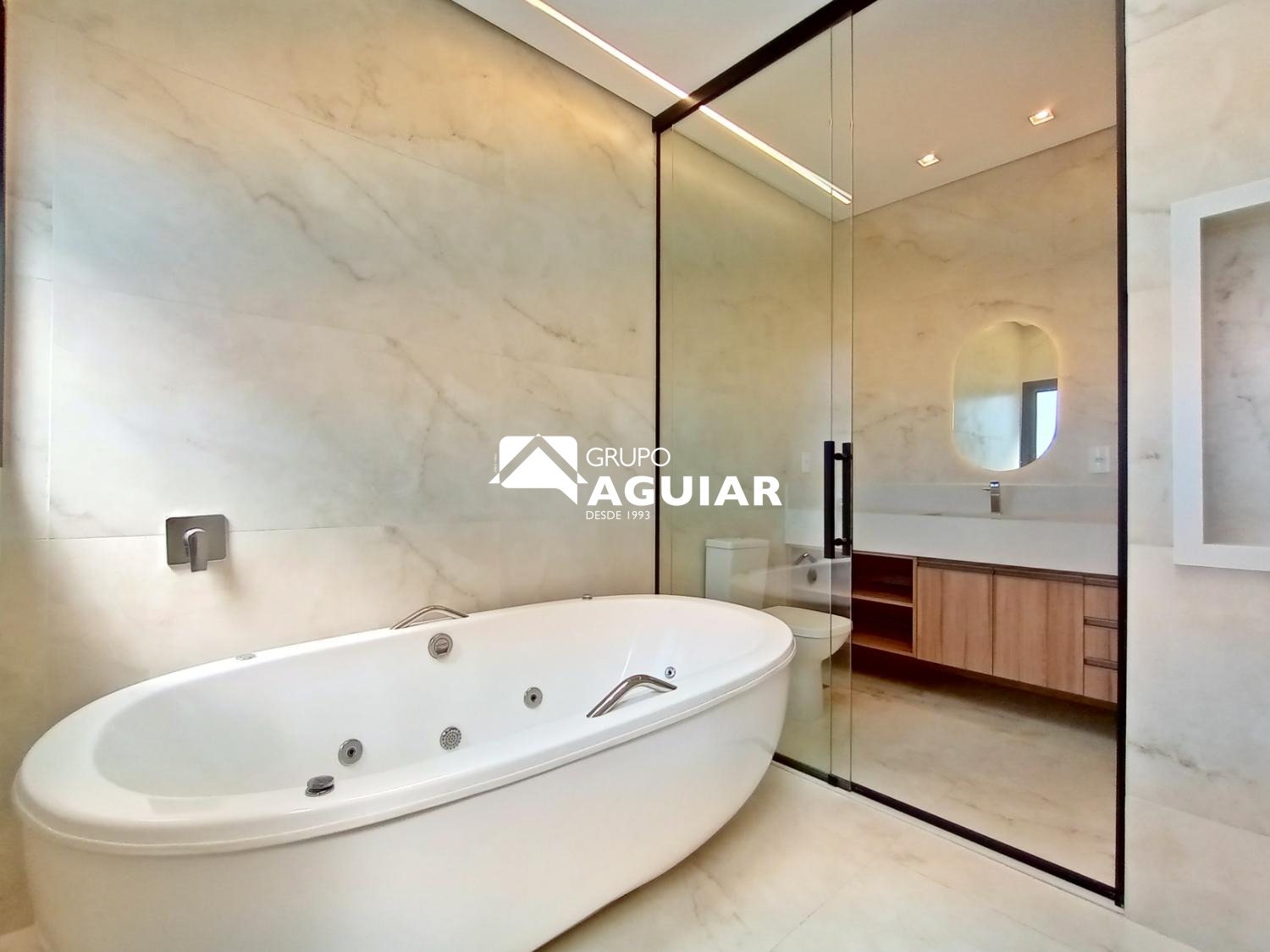 A suíte máster se destaca pelo closet e banheiro estilo spa, com banheira dupla, duas duchas de teto e iluminação natural através de claraboia (domus).