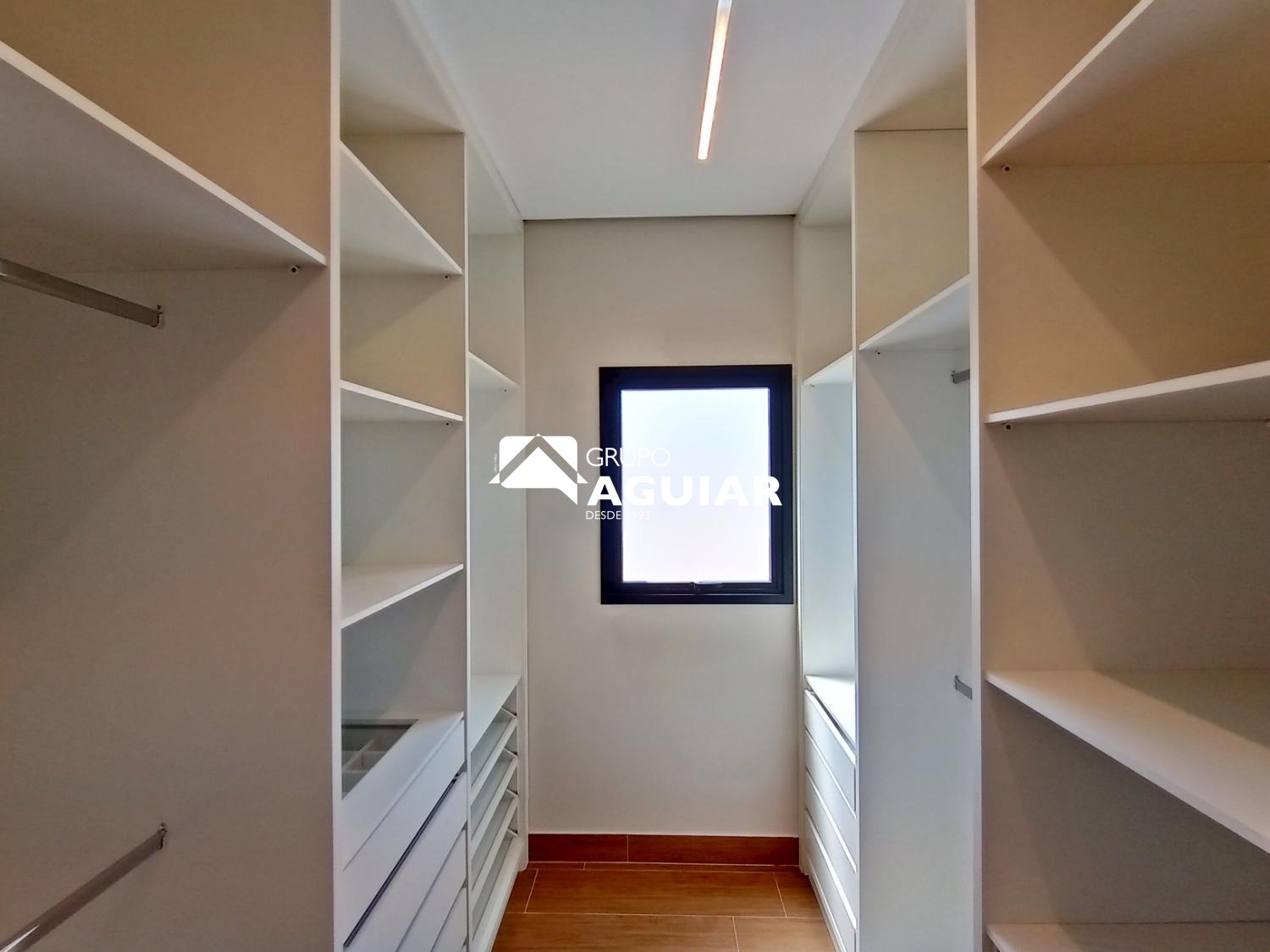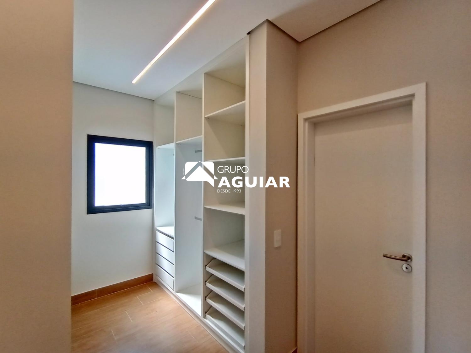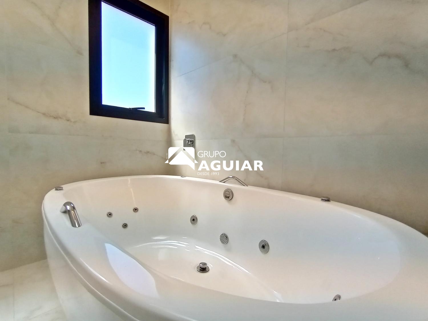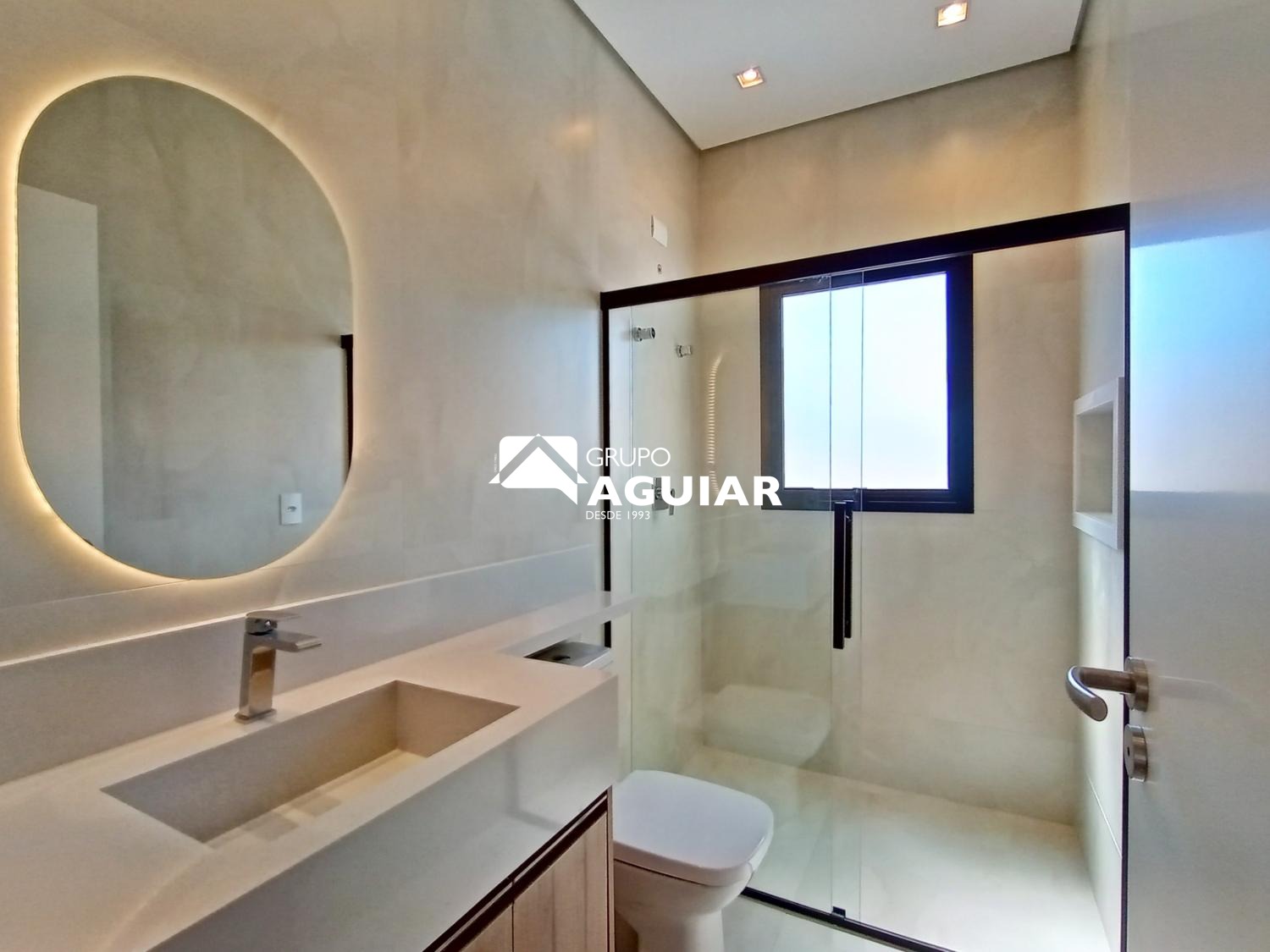A suíte máster se destaca pelo closet e banheiro estilo spa, com banheira dupla, duas duchas de teto e iluminação natural através de claraboia (domus).