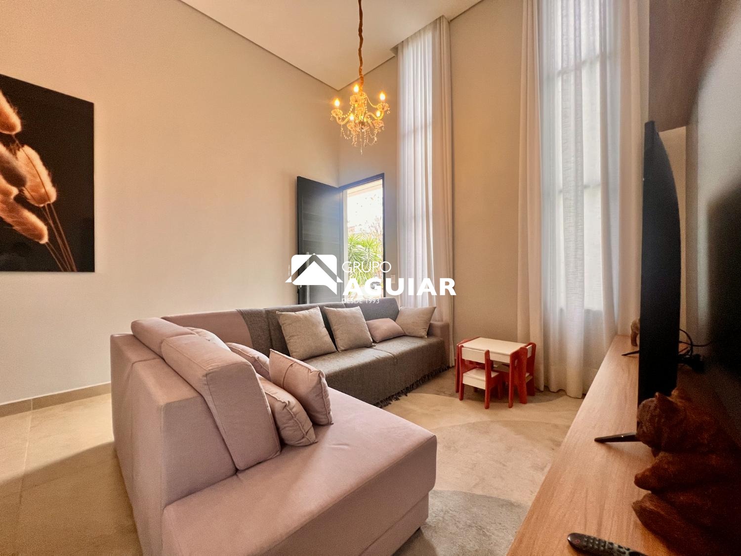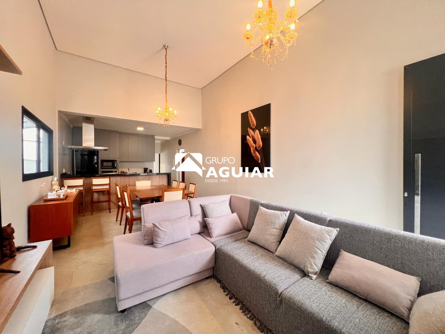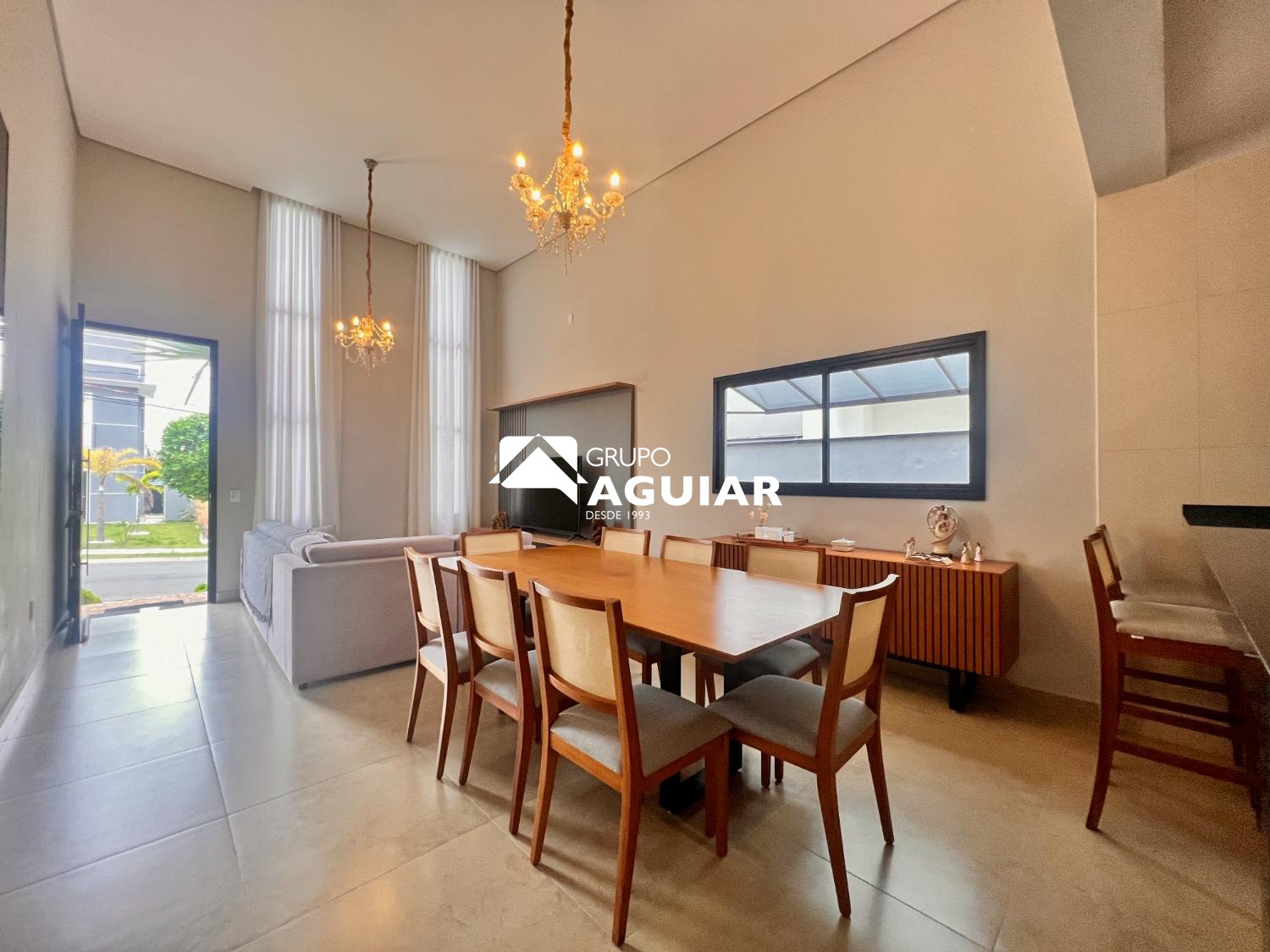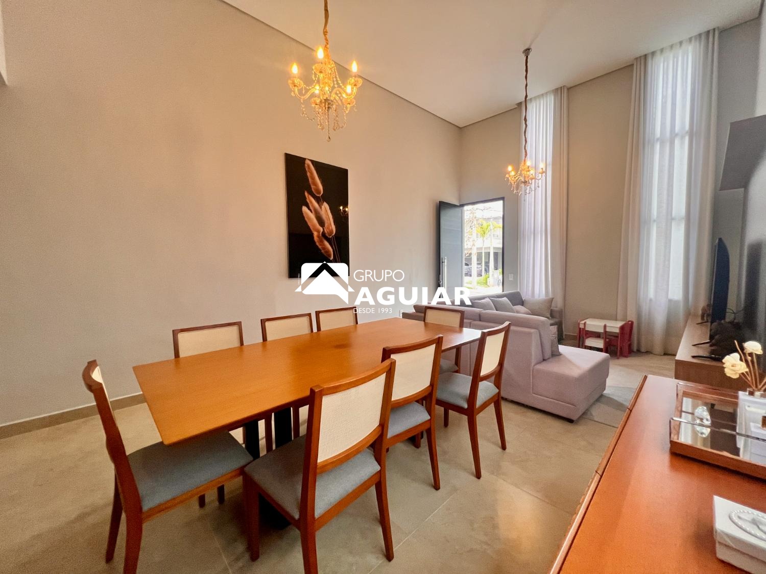 A casa conta com três dormitórios, sendo uma suíte, todos com planejados de excelente qualidade. O projeto moderno privilegia a integração dos ambientes e o pé-direito duplo nas salas garante amplitude e sofisticação.