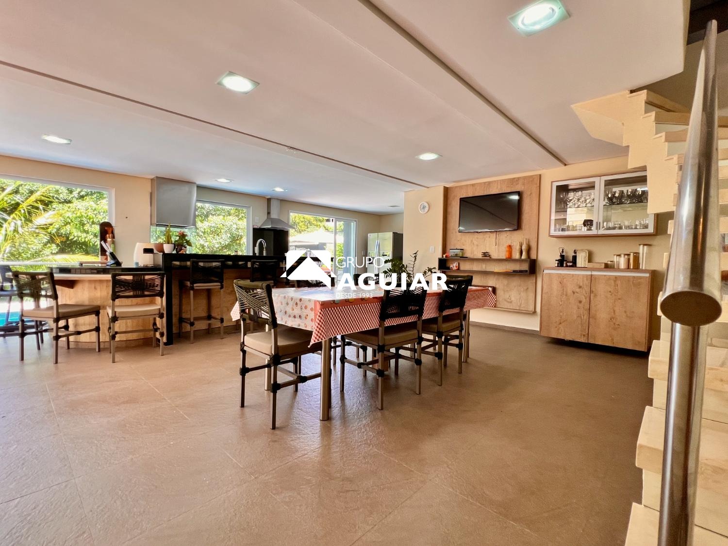 O imóvel apresenta padrão construtivo elevado, com acabamentos de qualidade e ambientes planejados. No pavimento térreo há um elegante hall de entrada que dá acesso a uma sala de estar e jantar integradas à cozinha ampla e planejada, com despensa de apoio, além de uma sala dedicada a home theater, escritório e banheiro social. Todo o pavimento é revestido em piso porcelanato. A circulação vertical é feita por escada Asa Delta (Espinha de Peixe) com degraus em balanço, conferindo leveza e sofisticação ao projeto. No pavimento superior encontra-se a área íntima, com três suítes em piso laminado, todas com ar-condicionado, sendo a suíte master equipada com closet e banheiro com hidromassagem, duas cubas, dois chuveiros e água quente em todas as torneiras. O pavimento inferior abriga um amplo espaço gourmet com churrasqueira, fogão e capacidade para receber mais de vinte convidados, integrado à área externa com piscina aquecida revestida em pedra São Tomé. O acesso interno à área da piscina se conecta a um spa interno com hidromassagem. Ainda neste nível há uma sala de jogos espaçosa com rack para televisão, um quarto de hóspedes, banheiro, lavanderia e área de serviço. O imóvel conta também com quintal, depósitos amplos sob a piscina e no corredor lateral, além de sistema de energia fotovoltaica e trocador de calor para a piscina.