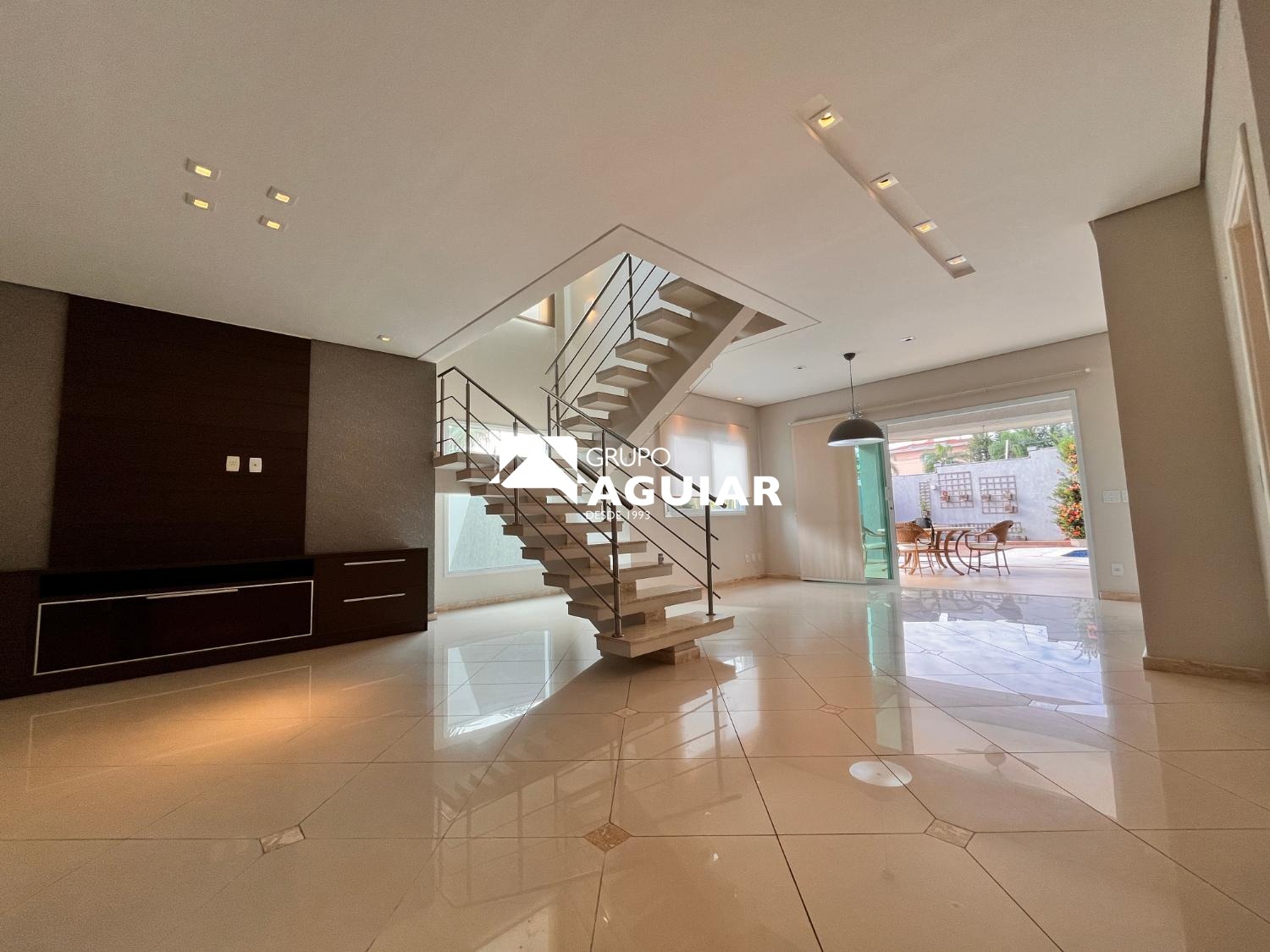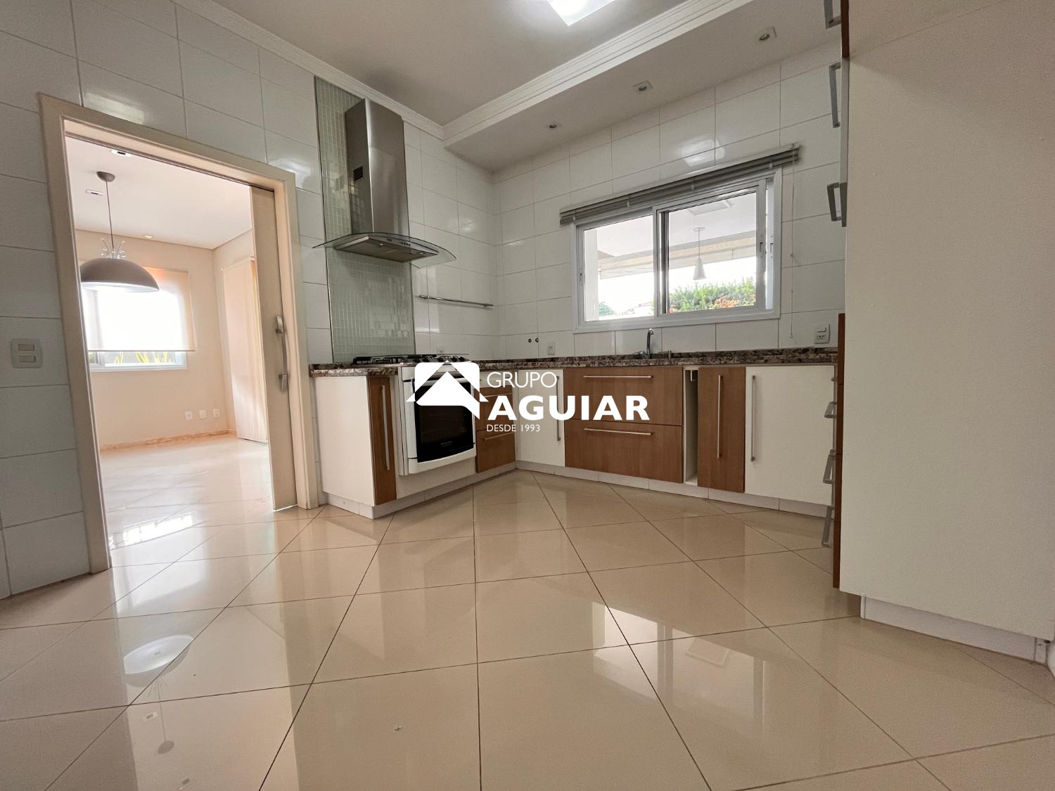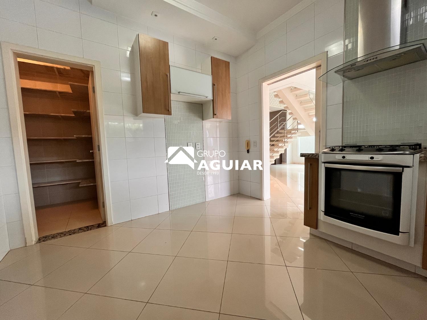 A área social é ampla e integrada, composta por sala de estar, sala de jantar e sala de TV, proporcionando espaços aconchegantes para convivência e recepção. A cozinha é planejada, equipada com fogão e coifa, além de despensa funcional. O imóvel ainda dispõe de lavabo e lavanderia com armários planejados.