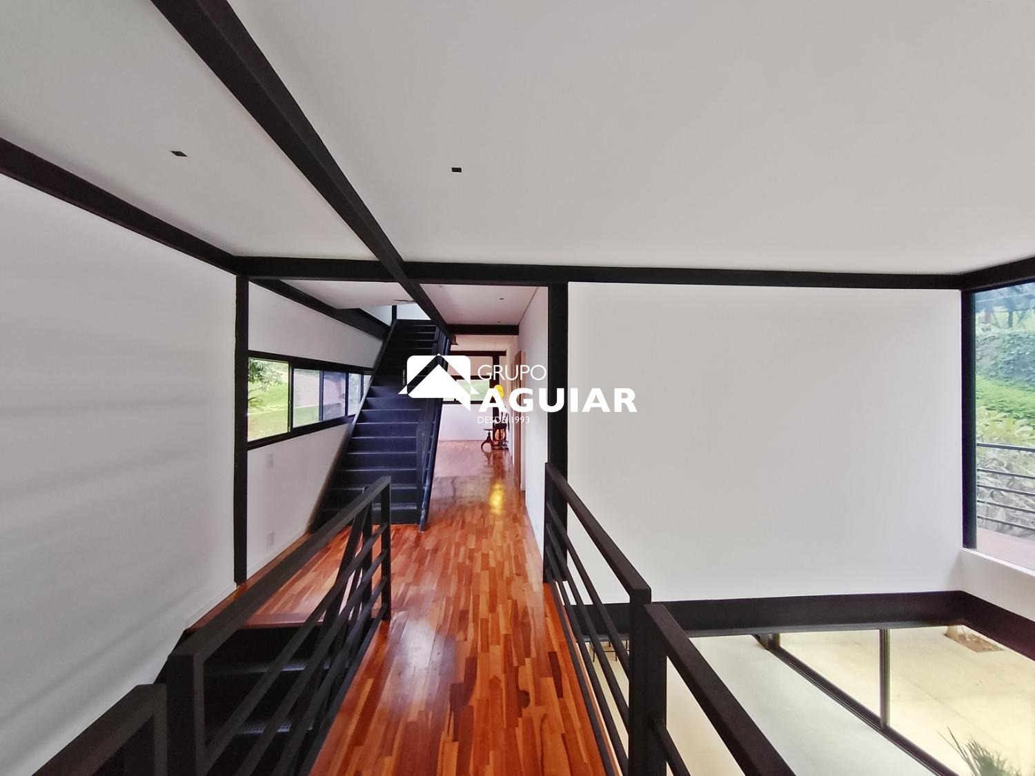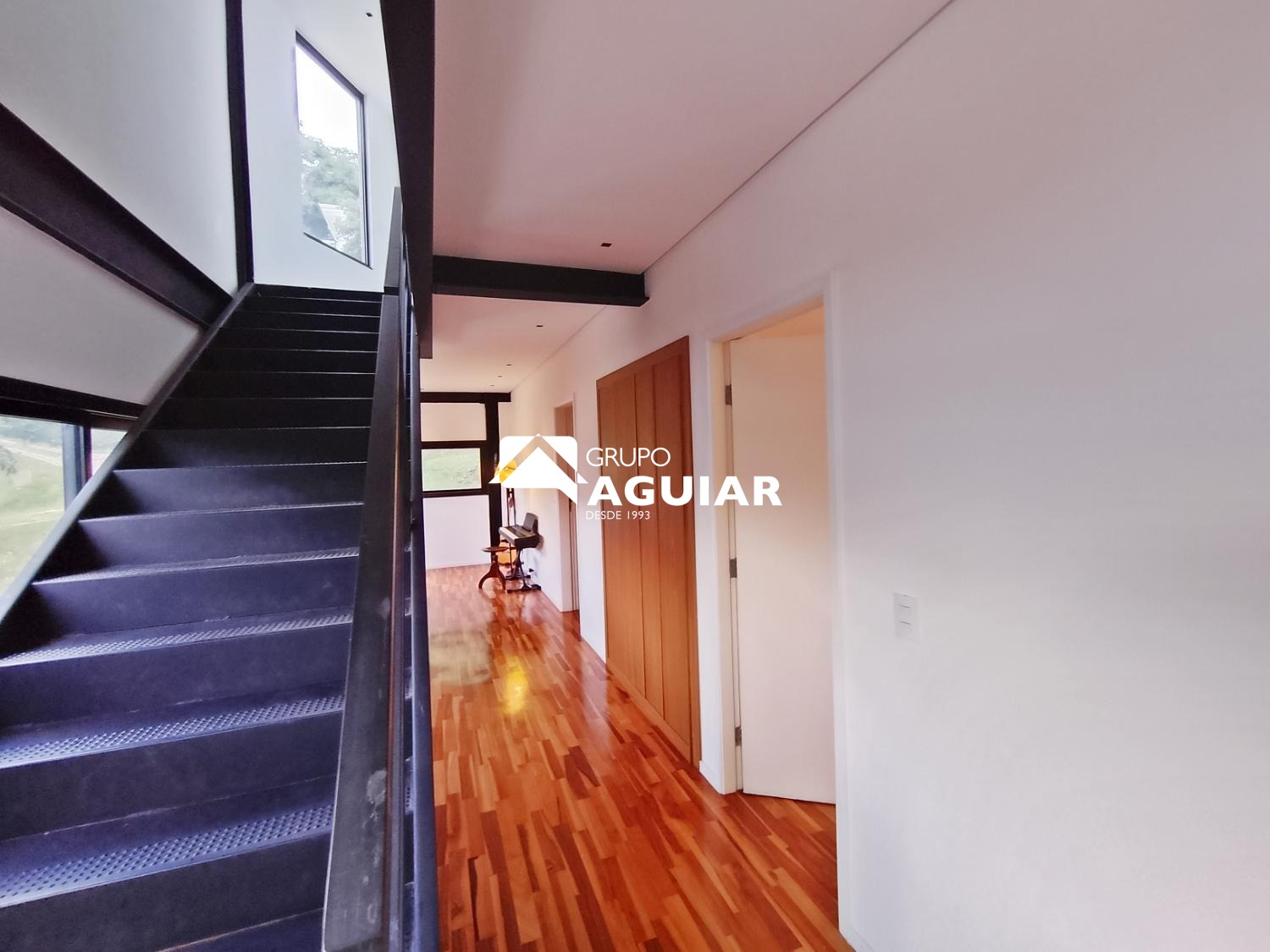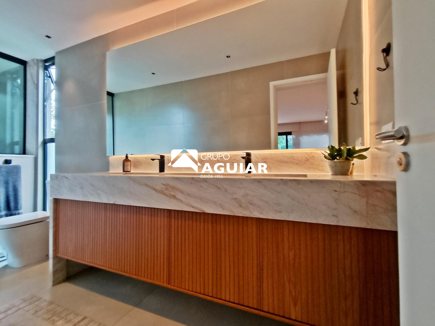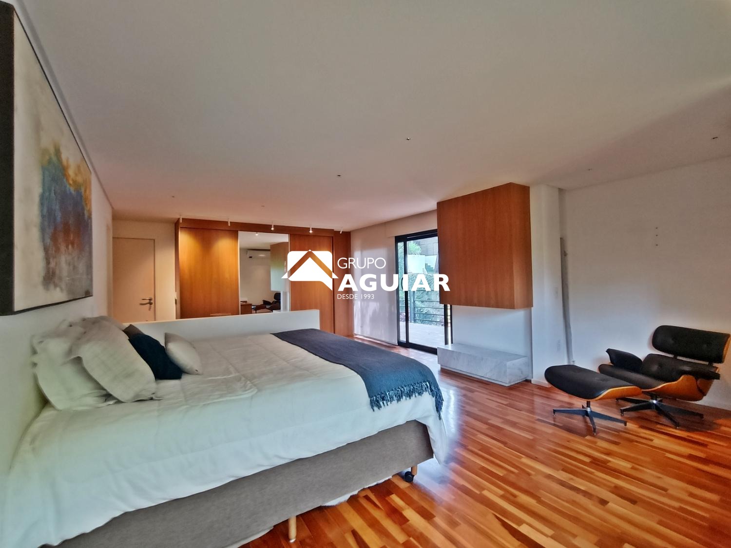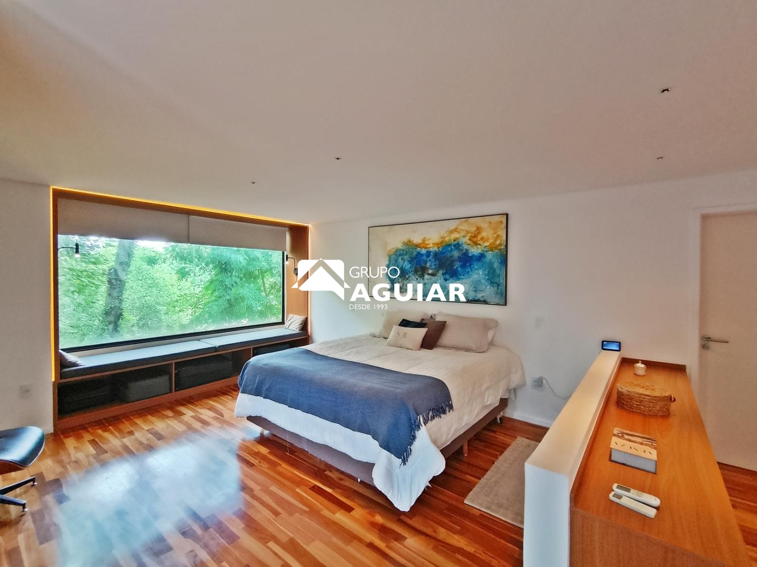No pavimento superior, as três suítes contam com armários planejados e vista para o verde, garantindo privacidade e conforto.