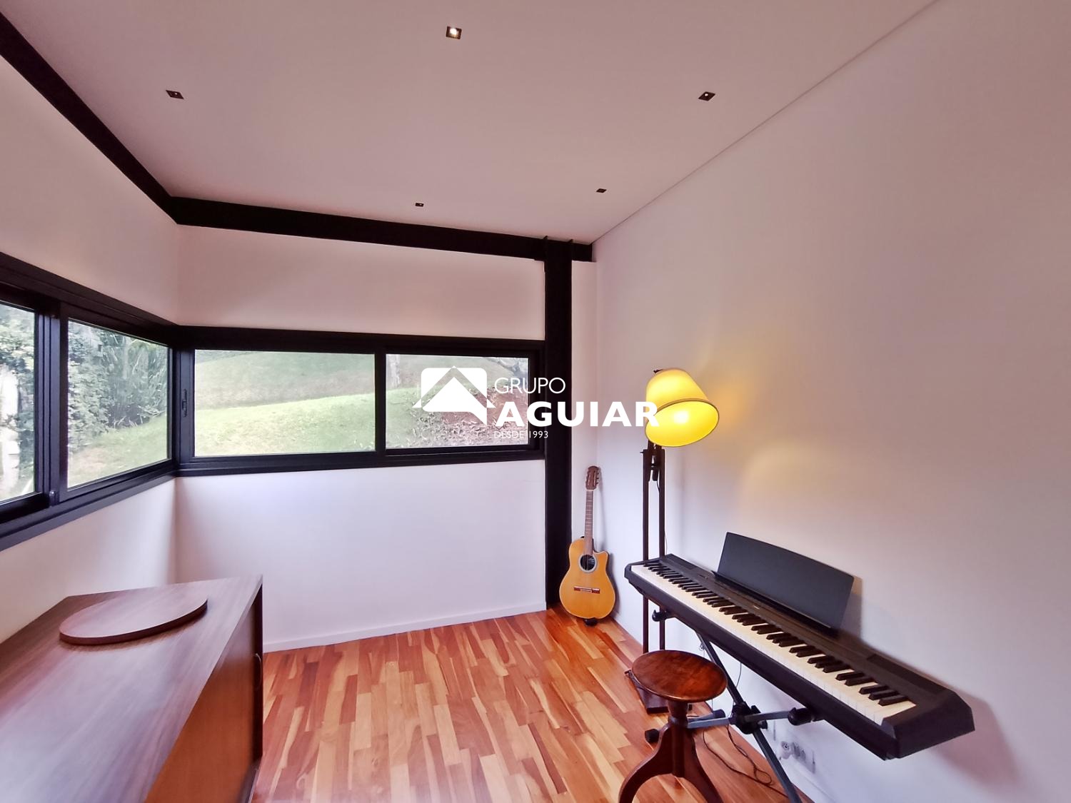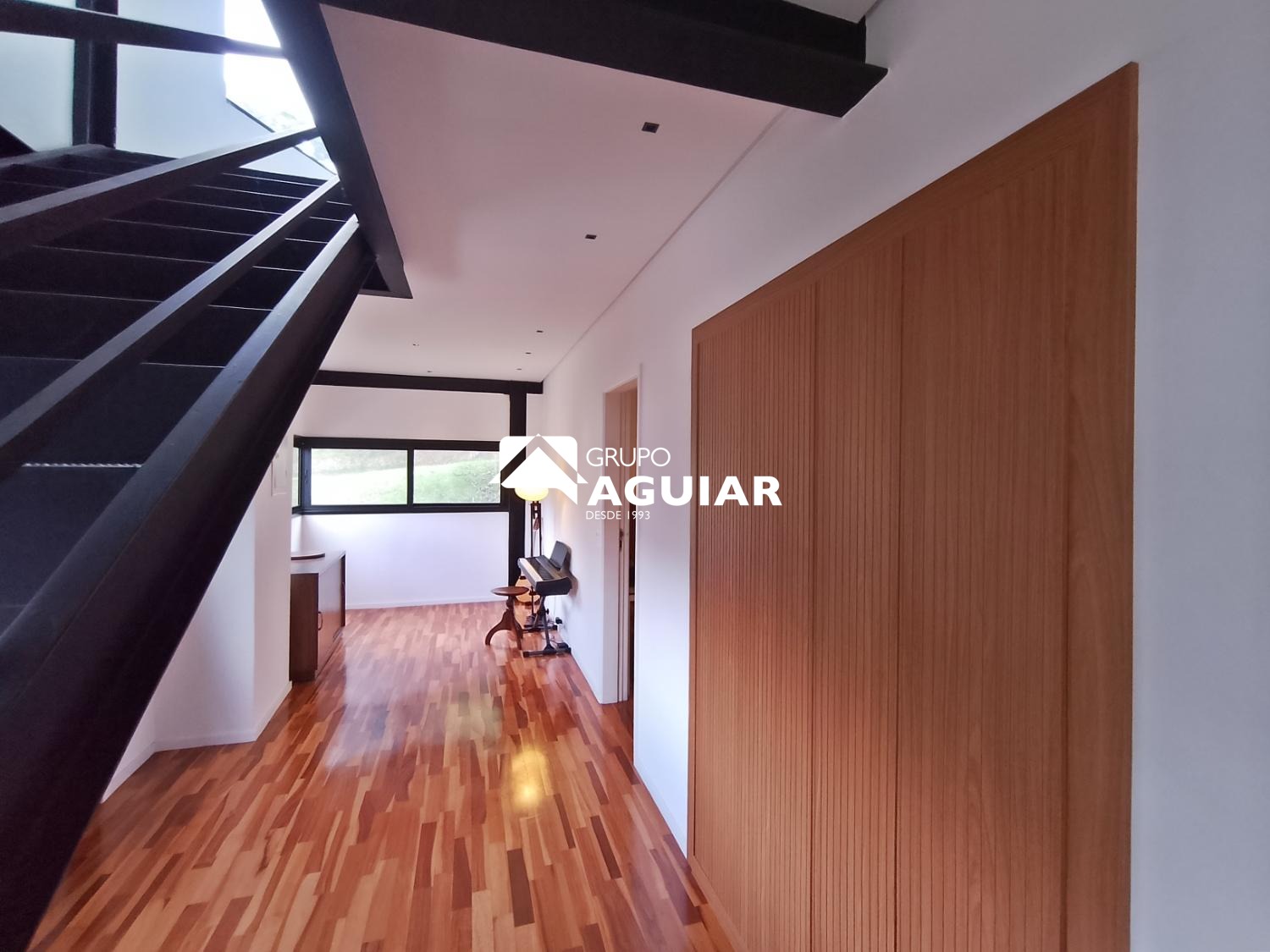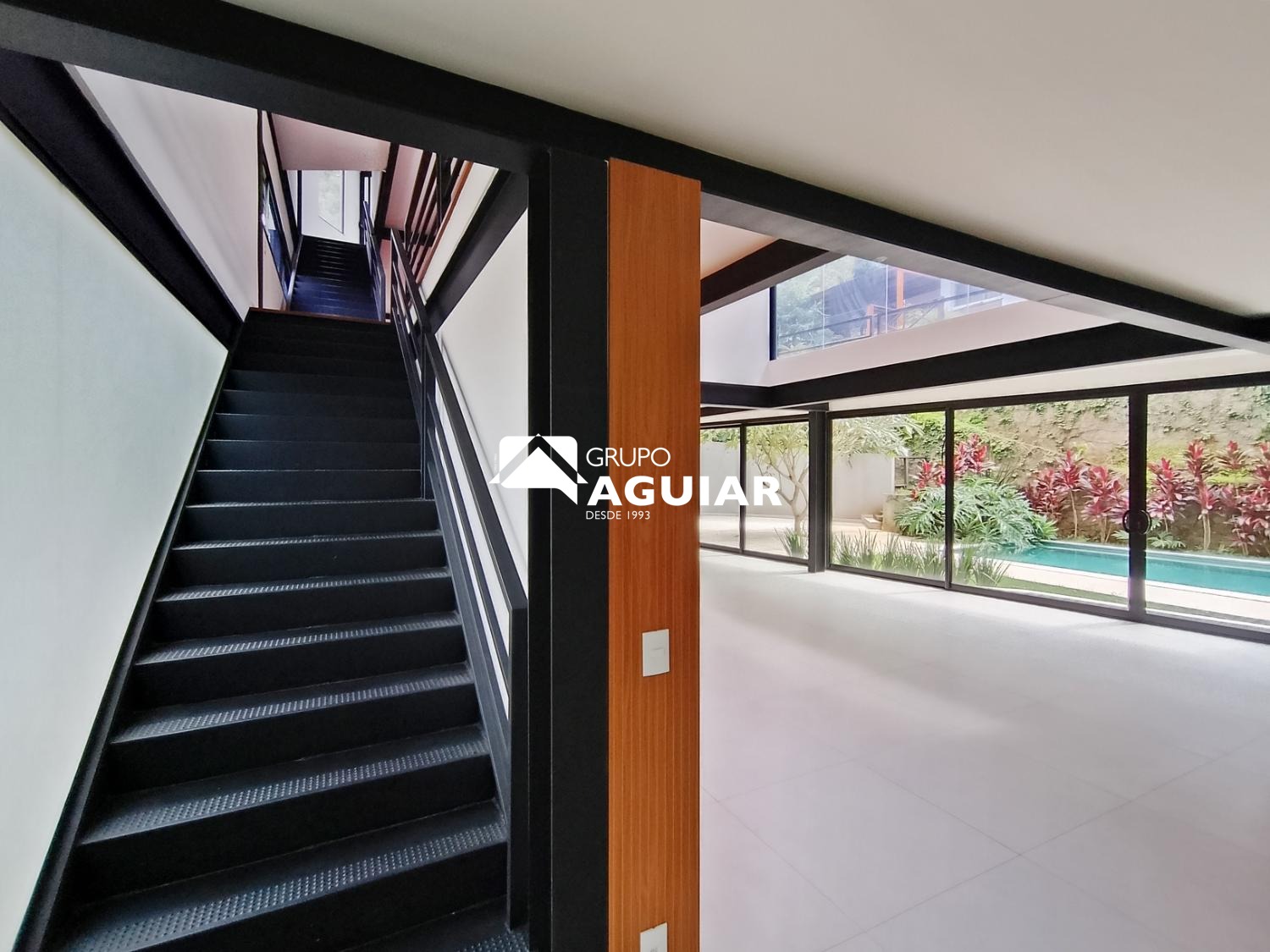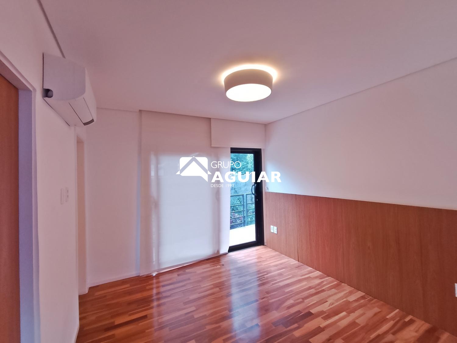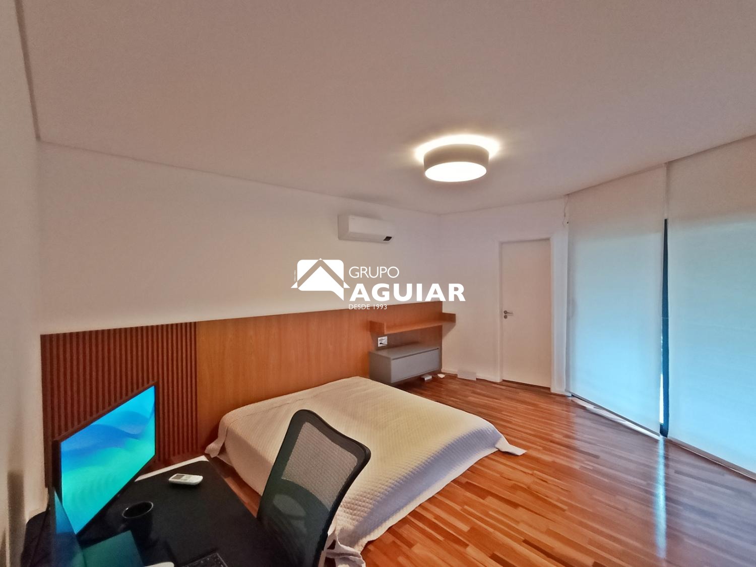 No pavimento superior, as três suítes contam com armários planejados e vista para o verde, garantindo privacidade e conforto.
