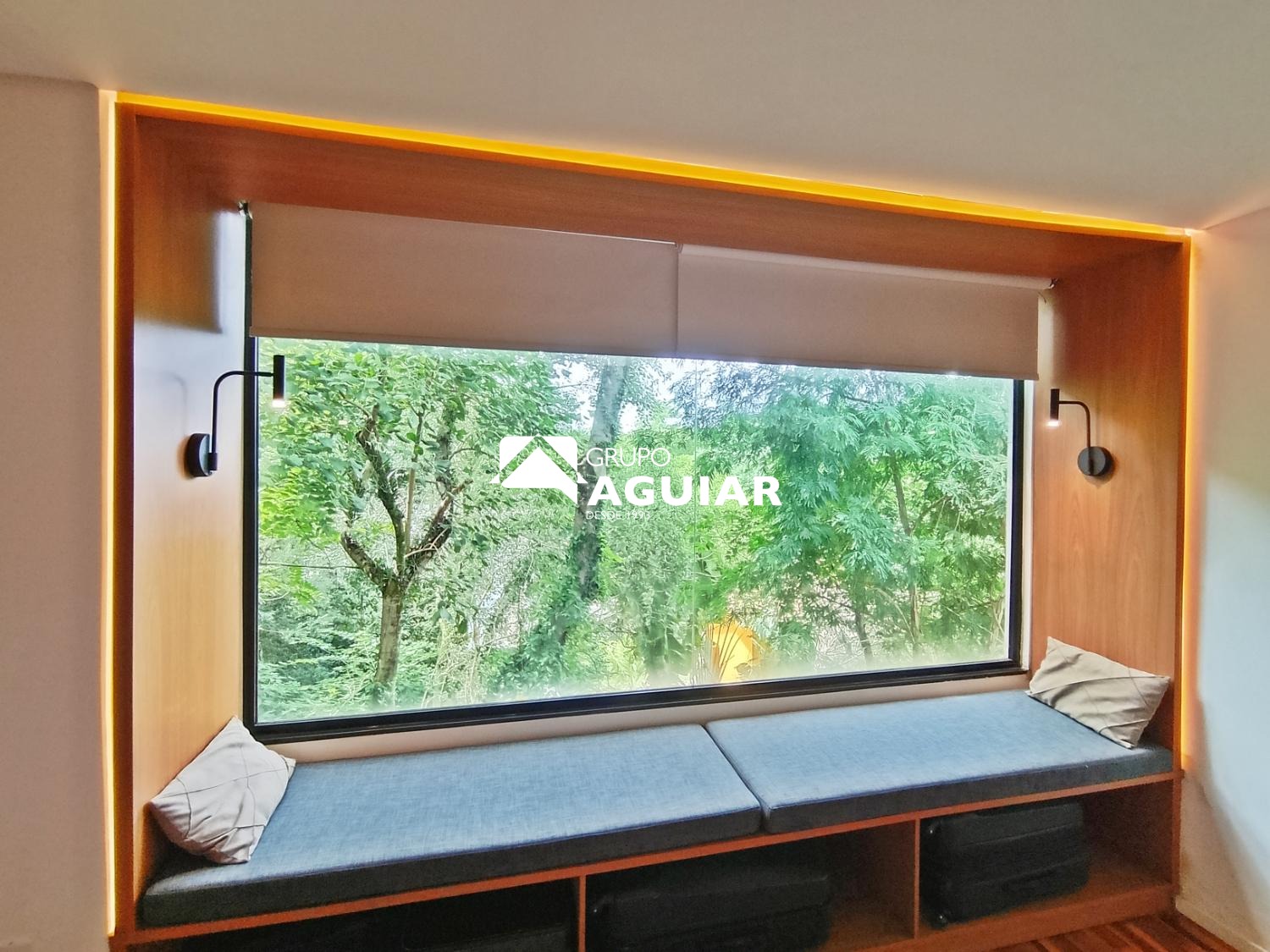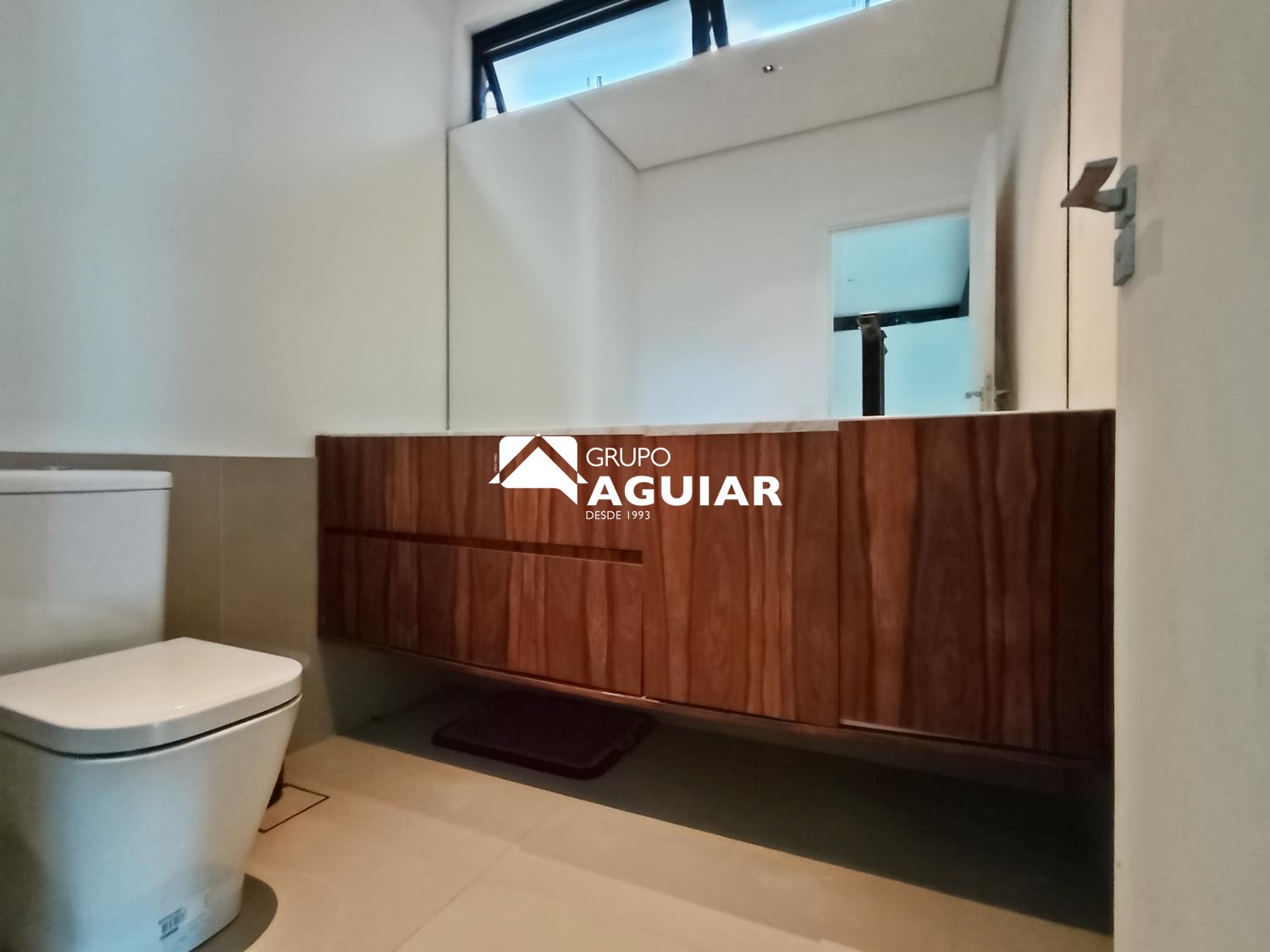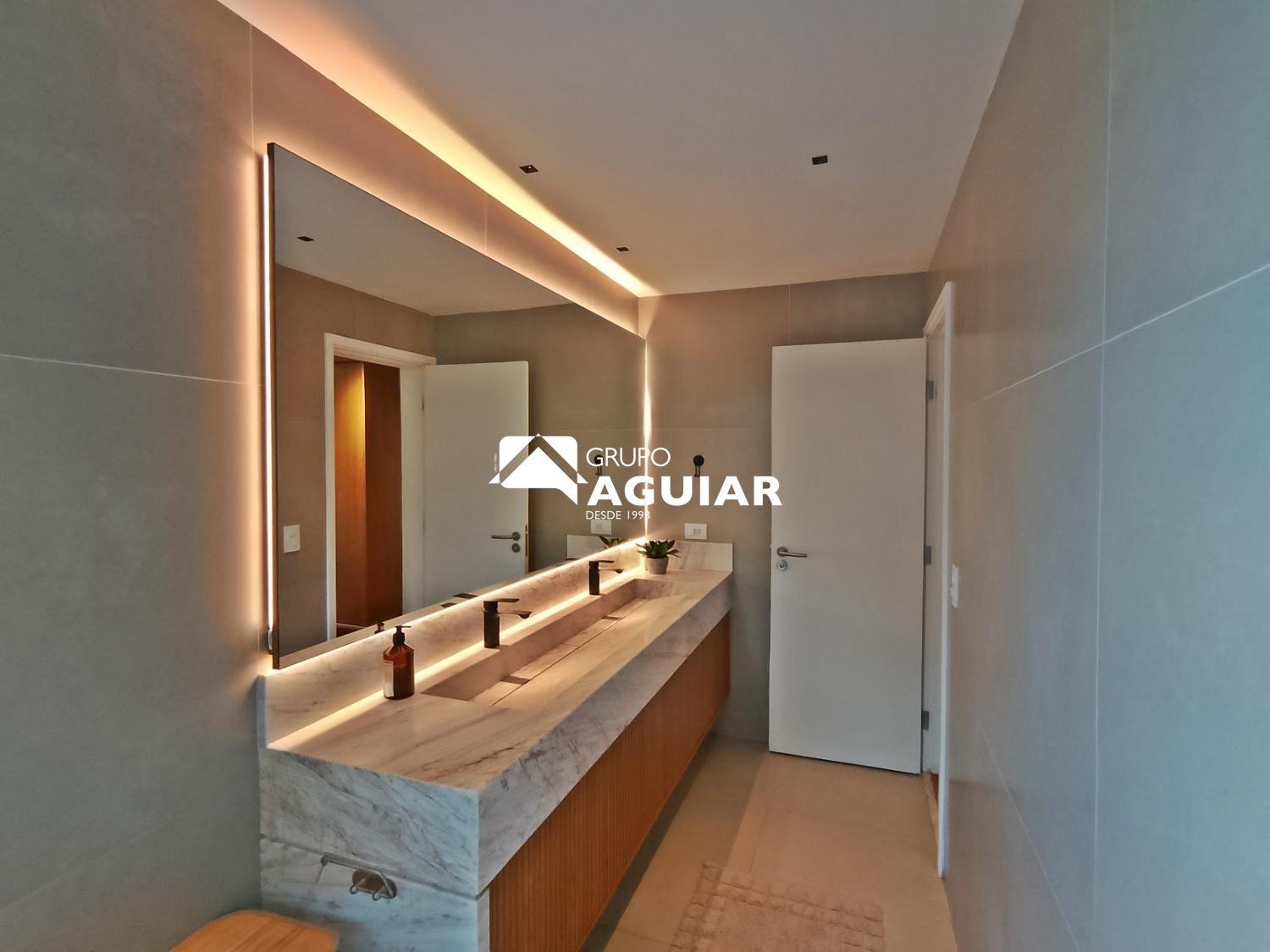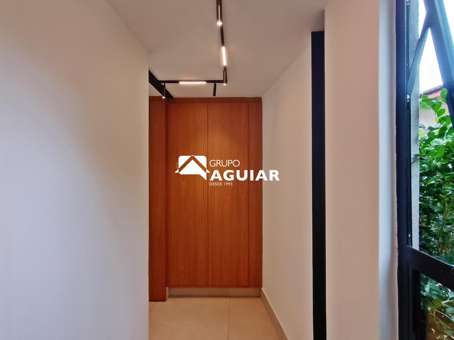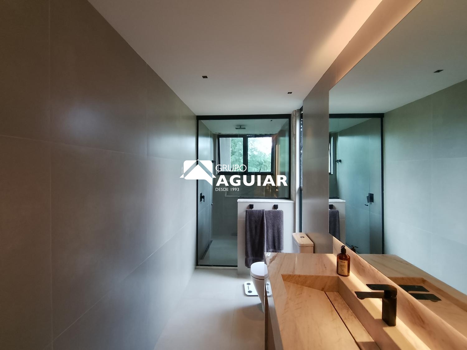 No pavimento superior, as três suítes contam com armários planejados e vista para o verde, garantindo privacidade e conforto.