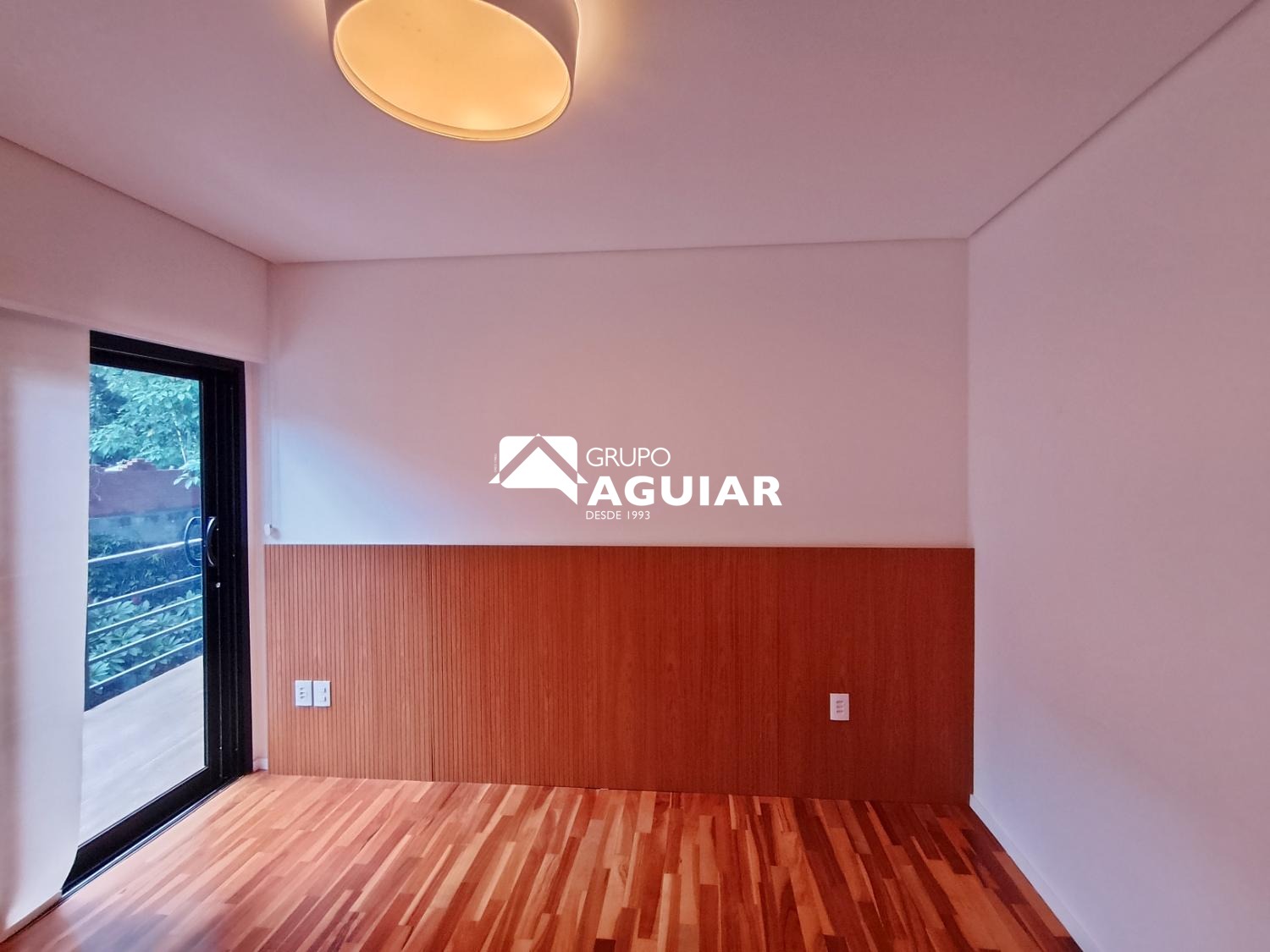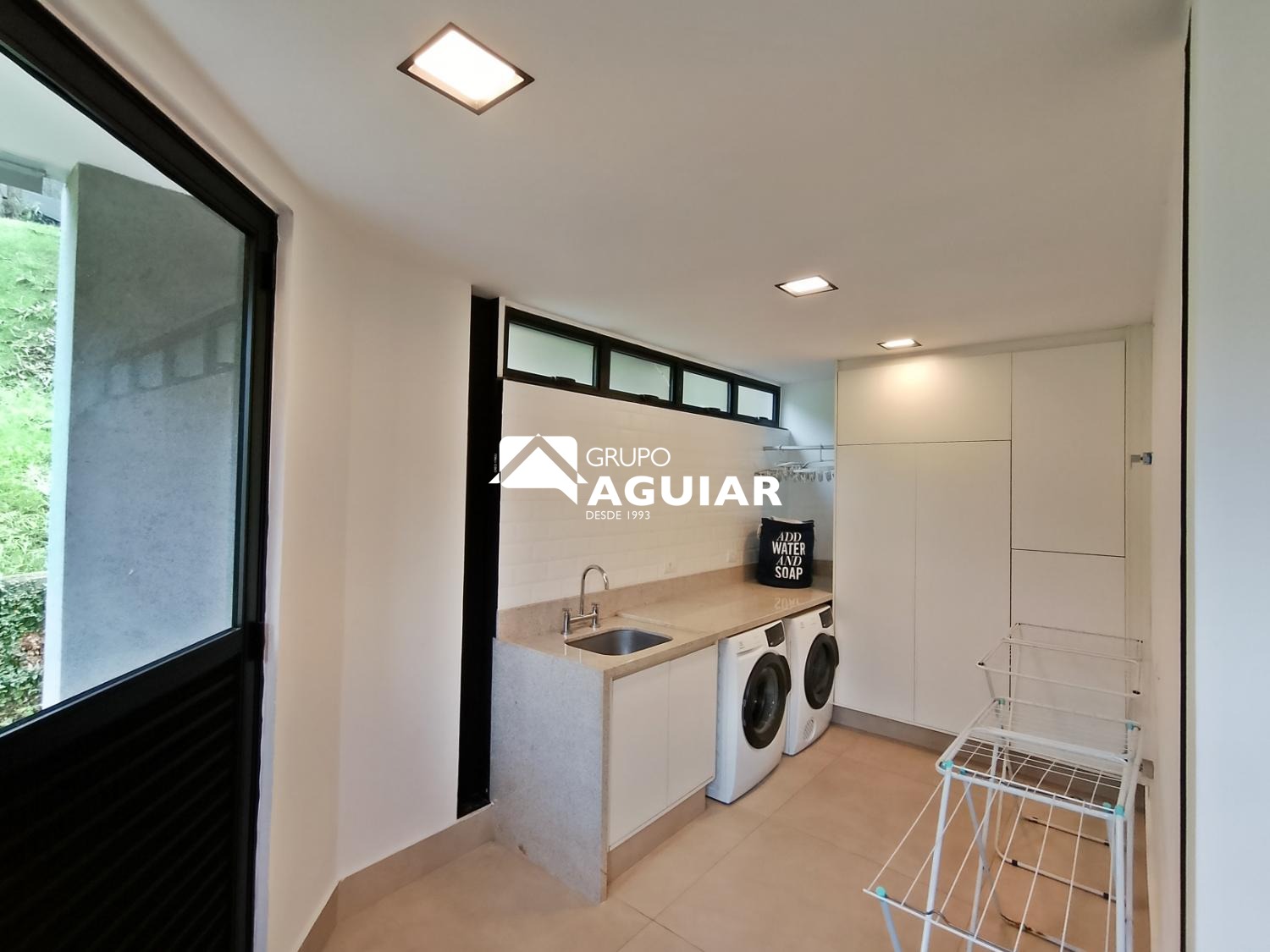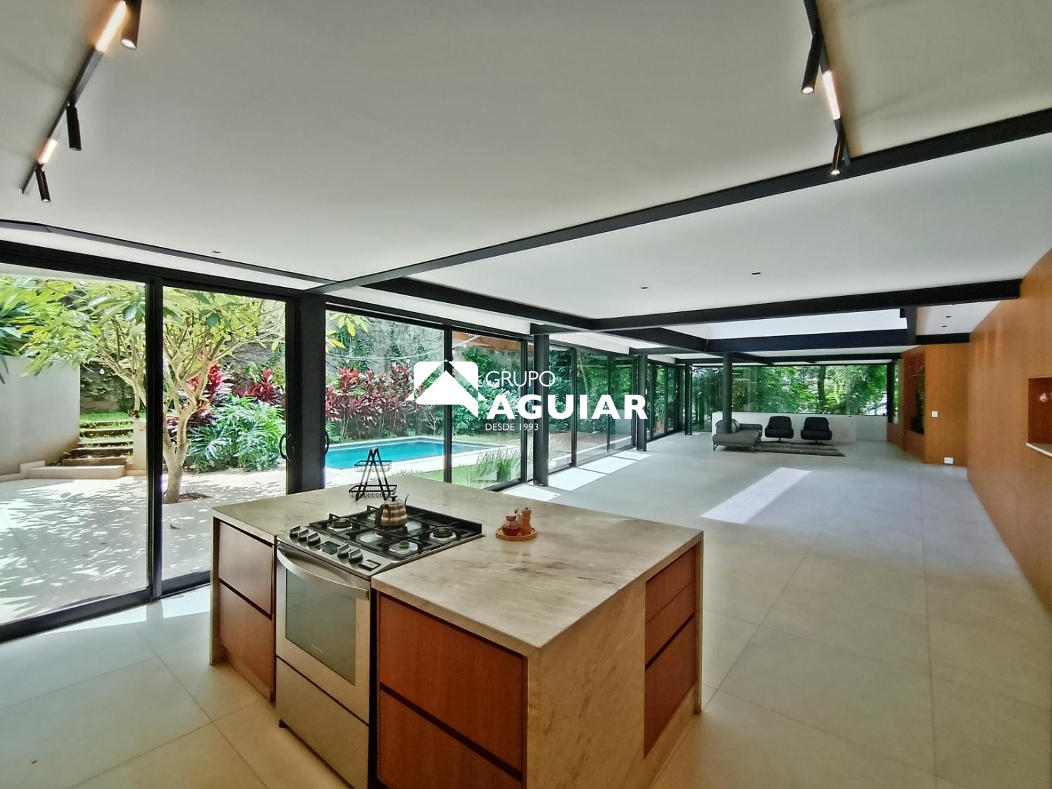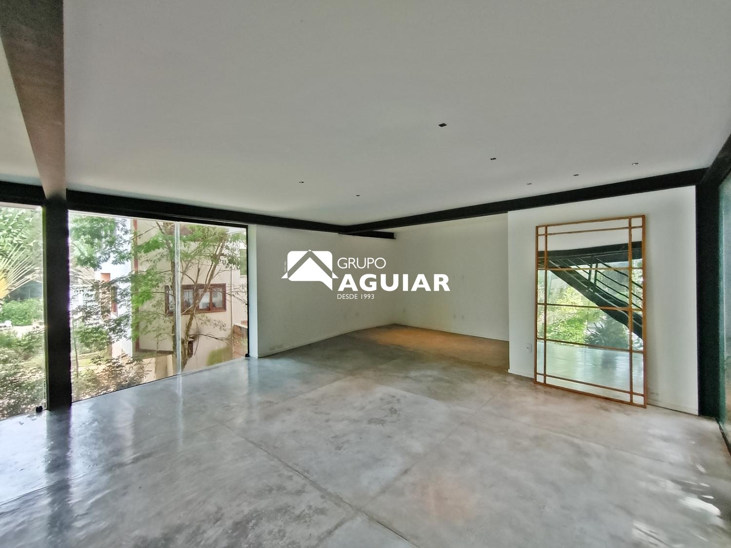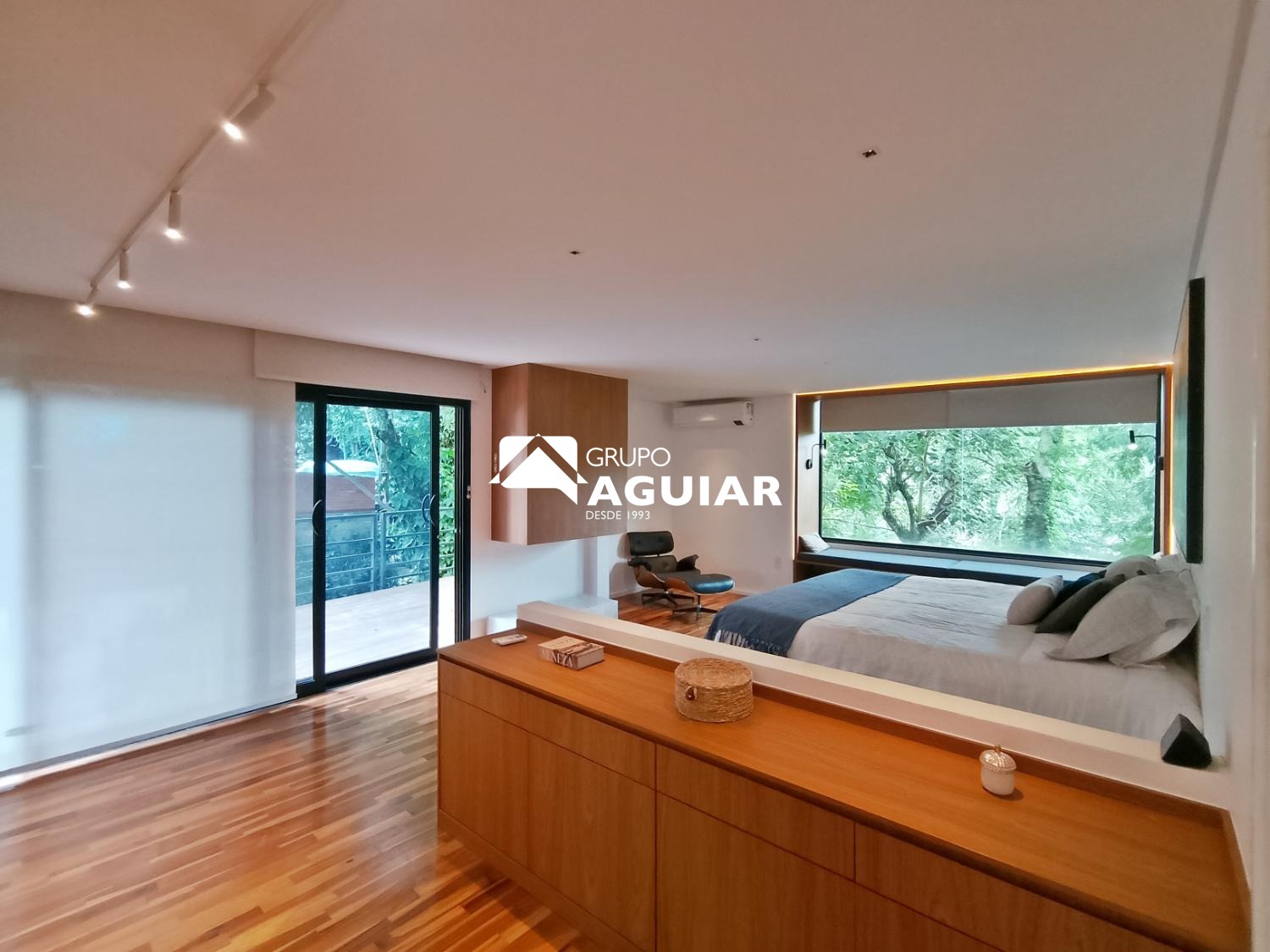 No pavimento superior, as três suítes contam com armários planejados e vista para o verde, garantindo privacidade e conforto.