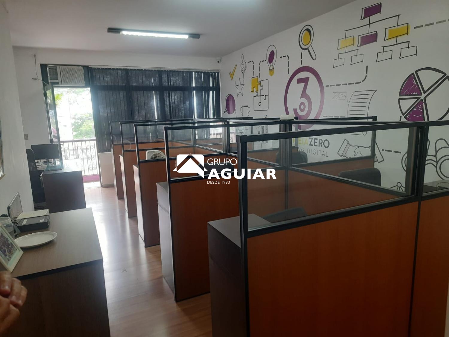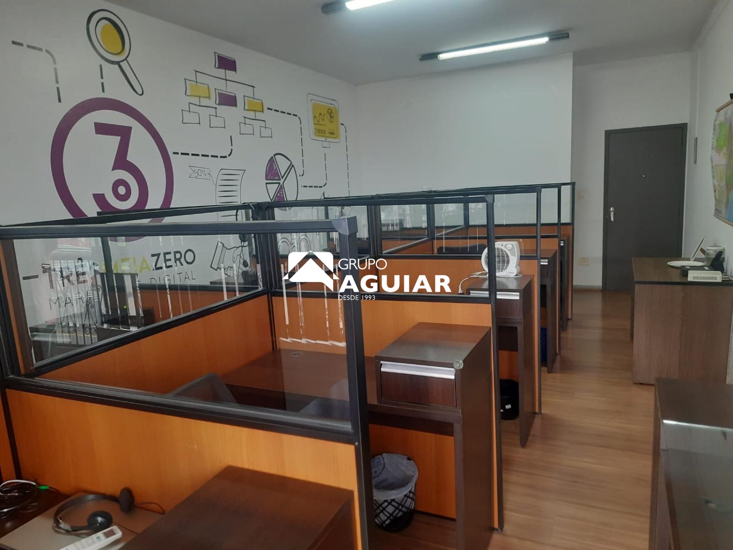A sala comercial está mobiliada, contando com baias, mesas e cadeiras, além de piso laminado e interfone. O imóvel possui cortinas e está localizado no pavimento térreo. Caso prefira o imóvel sem a mobília, é possível negociar o valor da locação.