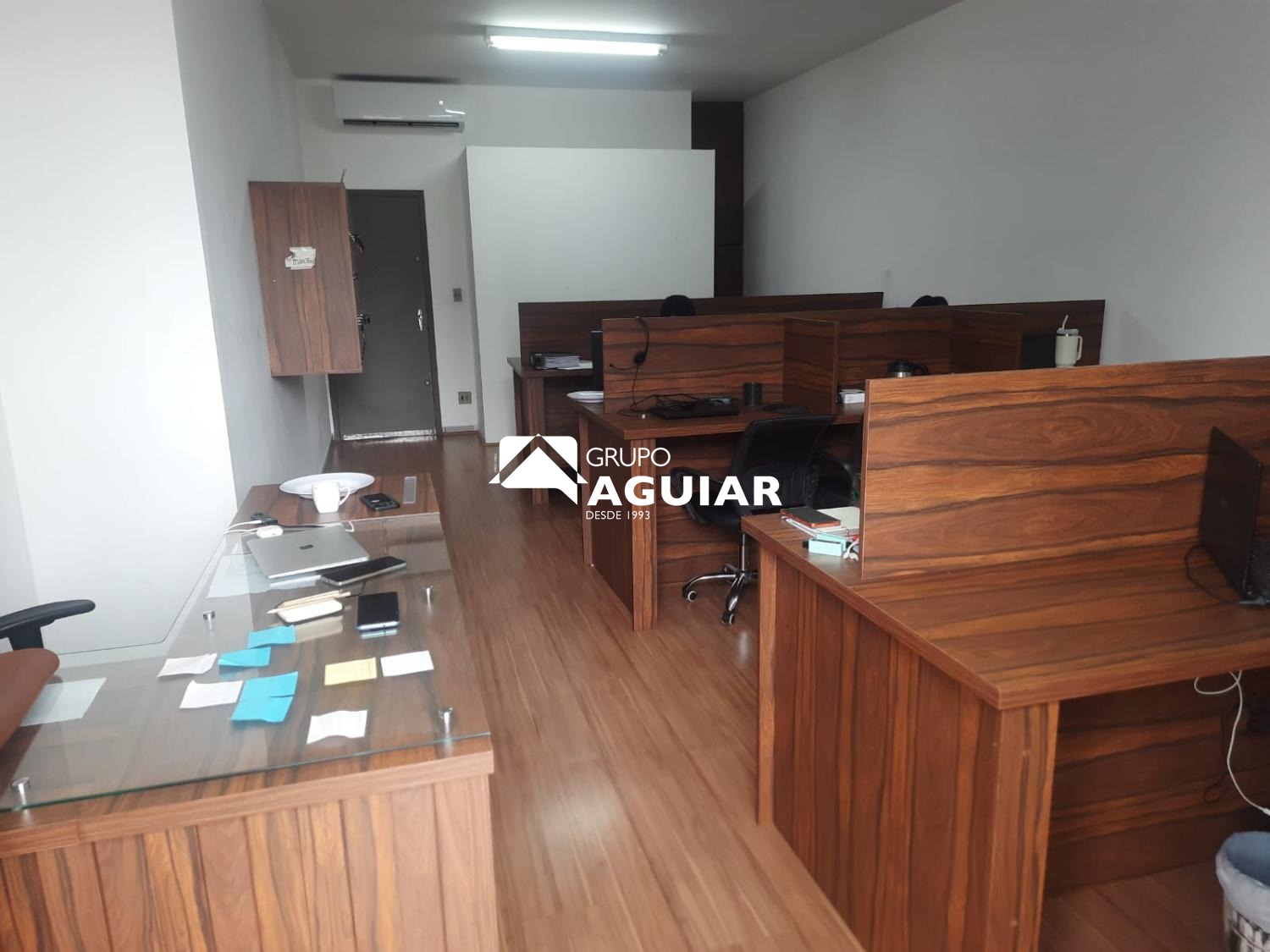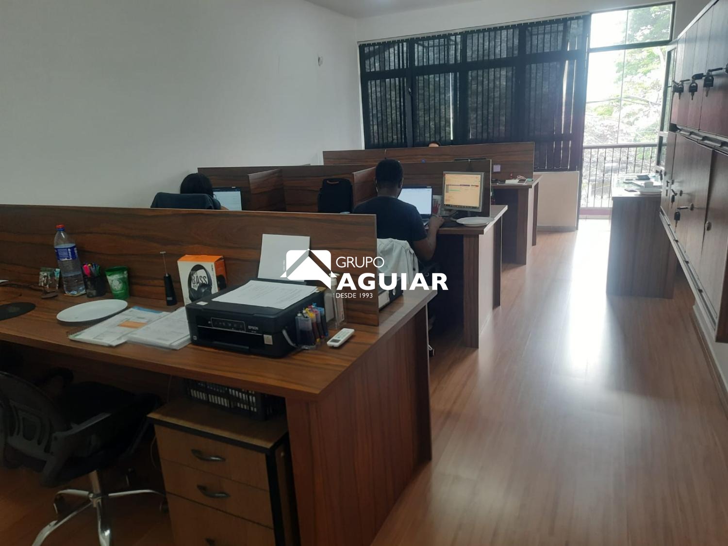 A sala comercial está mobiliada, contando com baias, mesas e cadeiras, além de piso laminado, interfone e varanda terraço. O imóvel está localizado no piso superior, com acesso por escadas. Caso prefira o imóvel sem a mobília, é possível negociar o valor da locação.